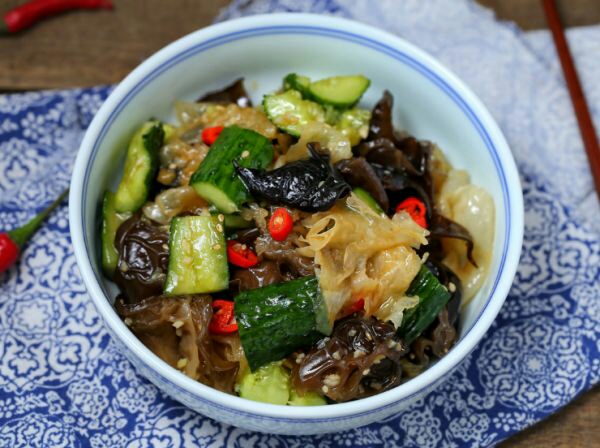 最后将黄瓜、银耳、木耳、料汁混合在一起,就可以装盘食用了。
