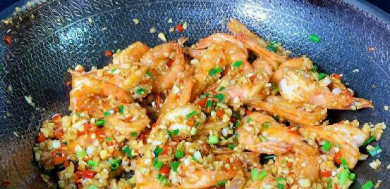 5,再撒上一把葱花翻炒均匀,最后沿锅边淋入一些香醋,激出香味,即可出锅装盘。这样一道蒜香浓郁,鲜嫩好吃的蒜蓉大虾就做好了。