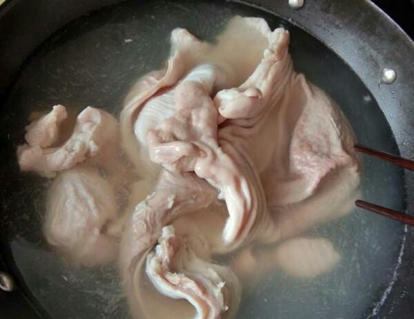 2、猪肚把表面的油抠掉,清洗干净。猪肚不好清洗,建议用淀粉、醋、盐和油反复搓洗几遍,直到把表面搓洗得粉粉的,没有粘液,冷水下锅,加入姜片和料酒,焯煮5分钟,捞出洗净,切成条状,再次冲洗干净。