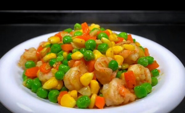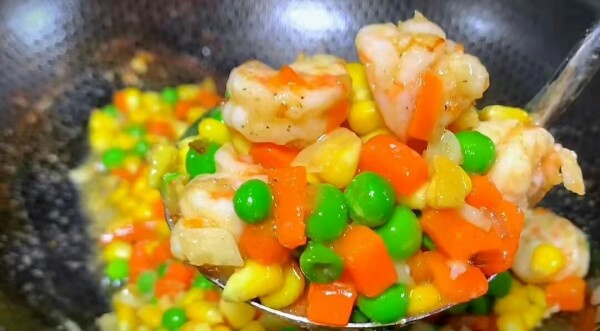 食材准备:大虾,料酒,食盐,胡椒粉,胡萝卜,玉米,青豆等。