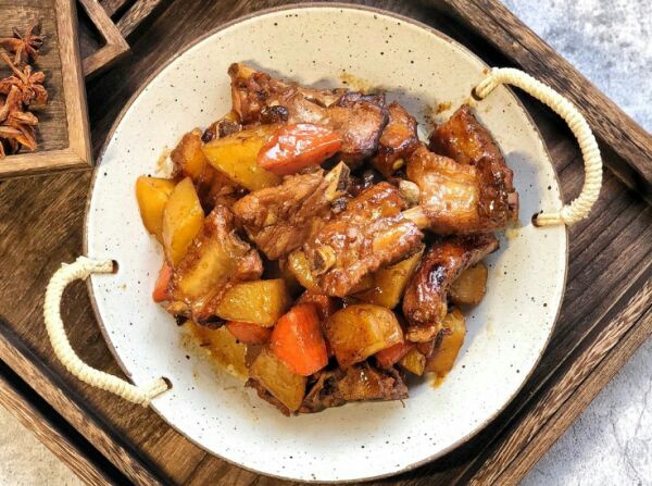 接着转小火炖煮,煮到排骨变软,我一般用高压锅压十五分钟。煮好后去掉葱姜,再放入土豆、胡萝卜,继续小火炖煮。