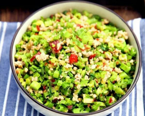 芹菜去掉根部,清洗干净,再将芹菜切碎待用。猪肉冲洗干净,剁成肉末。大蒜、生姜洗净切碎。小米椒洗净切碎。不吃辣就不准备辣椒。
