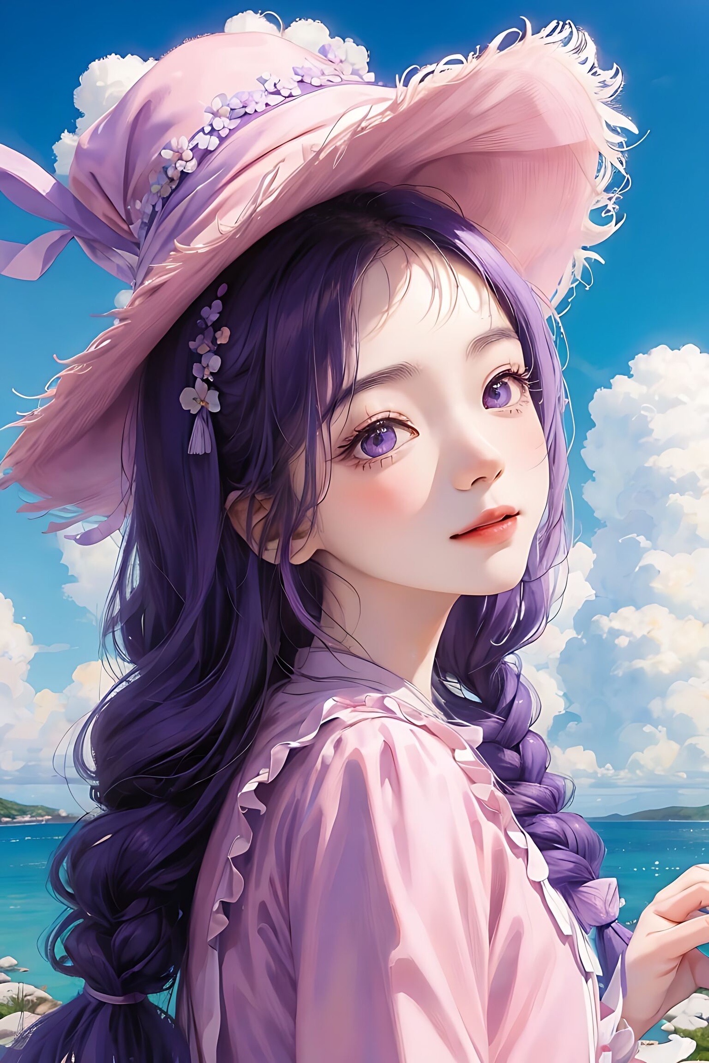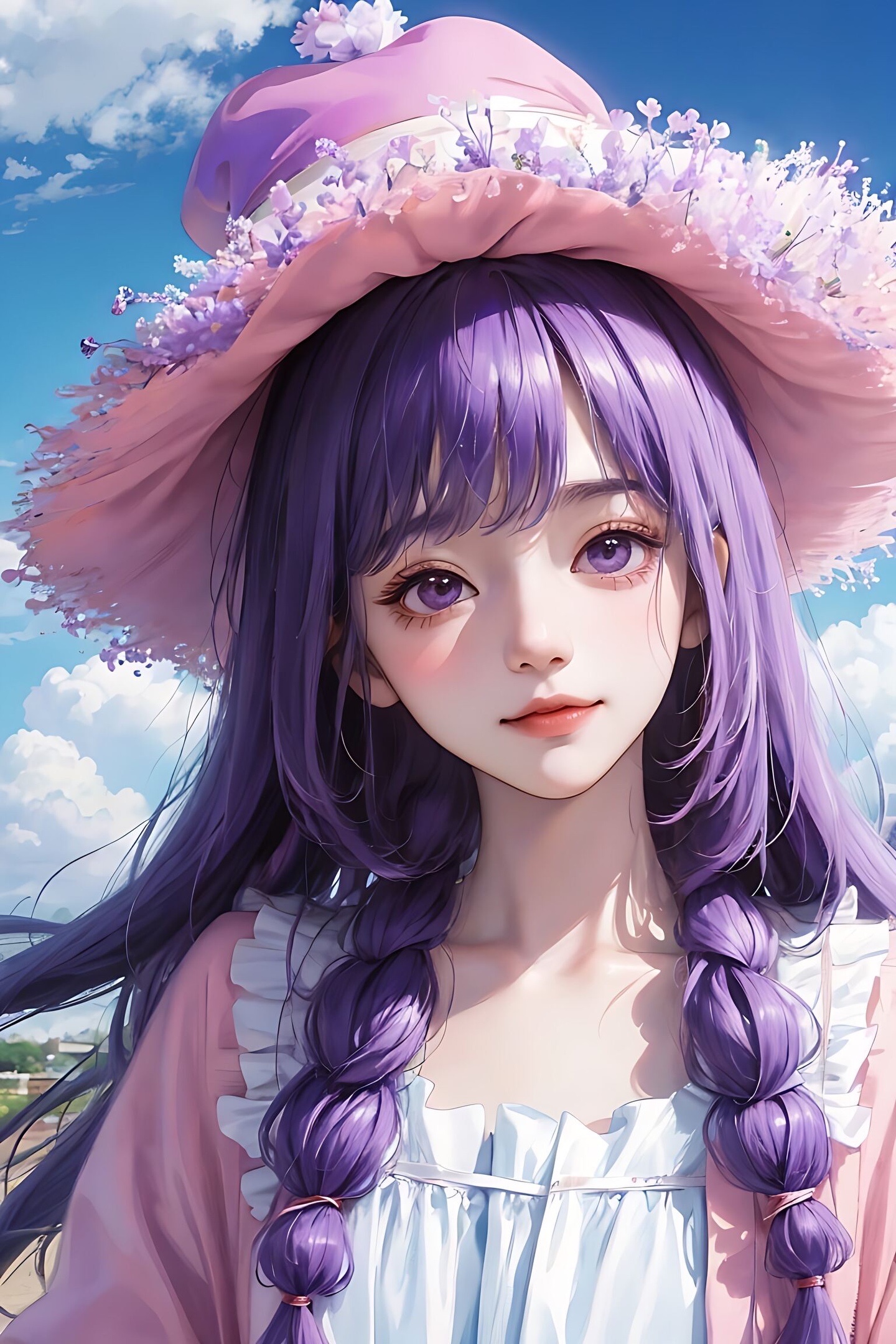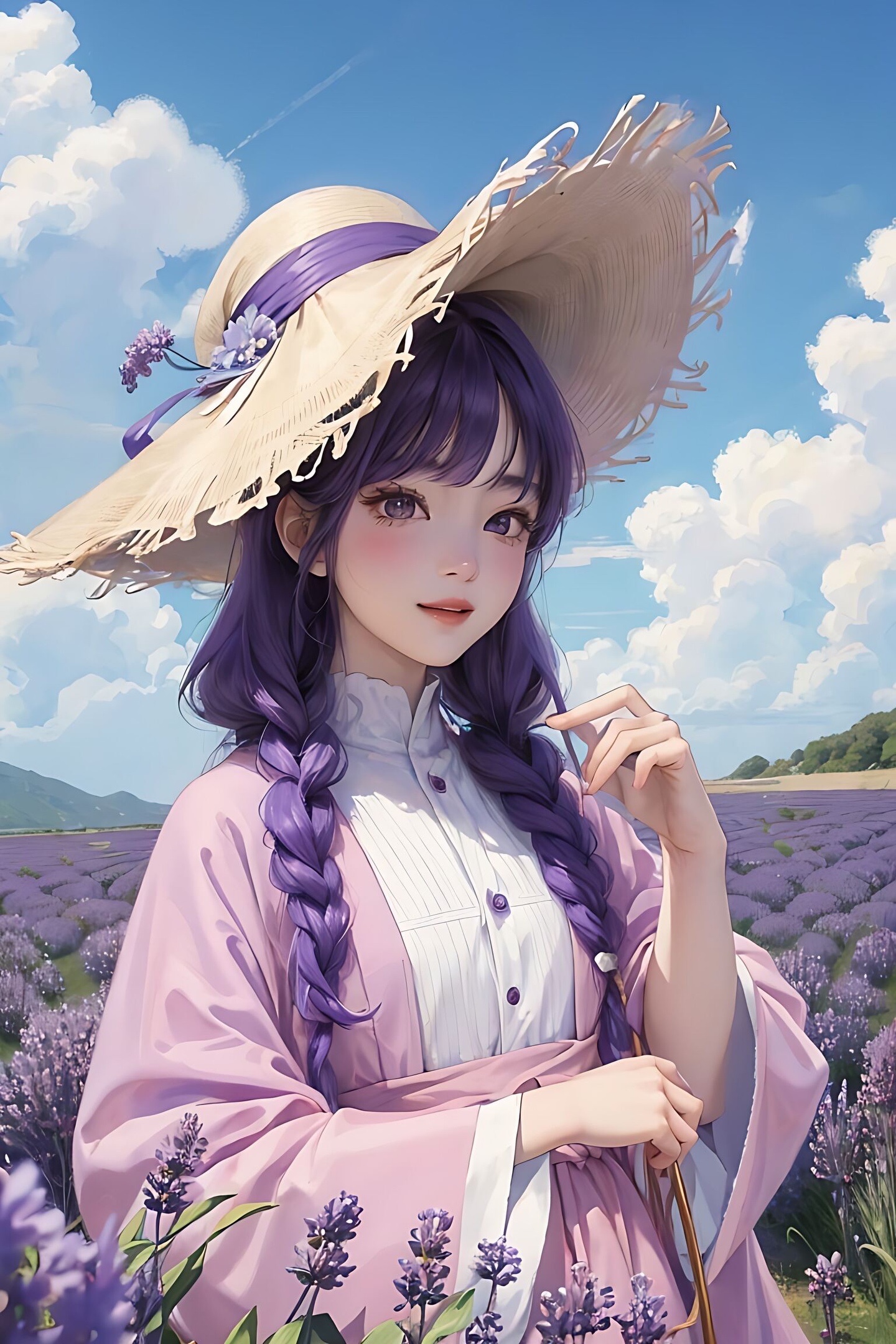宫崎骏 1个女孩 戴粉色圆帽子,蓝天白云,,羊毛卷头发,身后有薰衣草花海,开心的笑,根根分明的睫毛 大眼睛,紫色薰衣草衣服,8KCG壁纸,最佳质量,特写,半身像