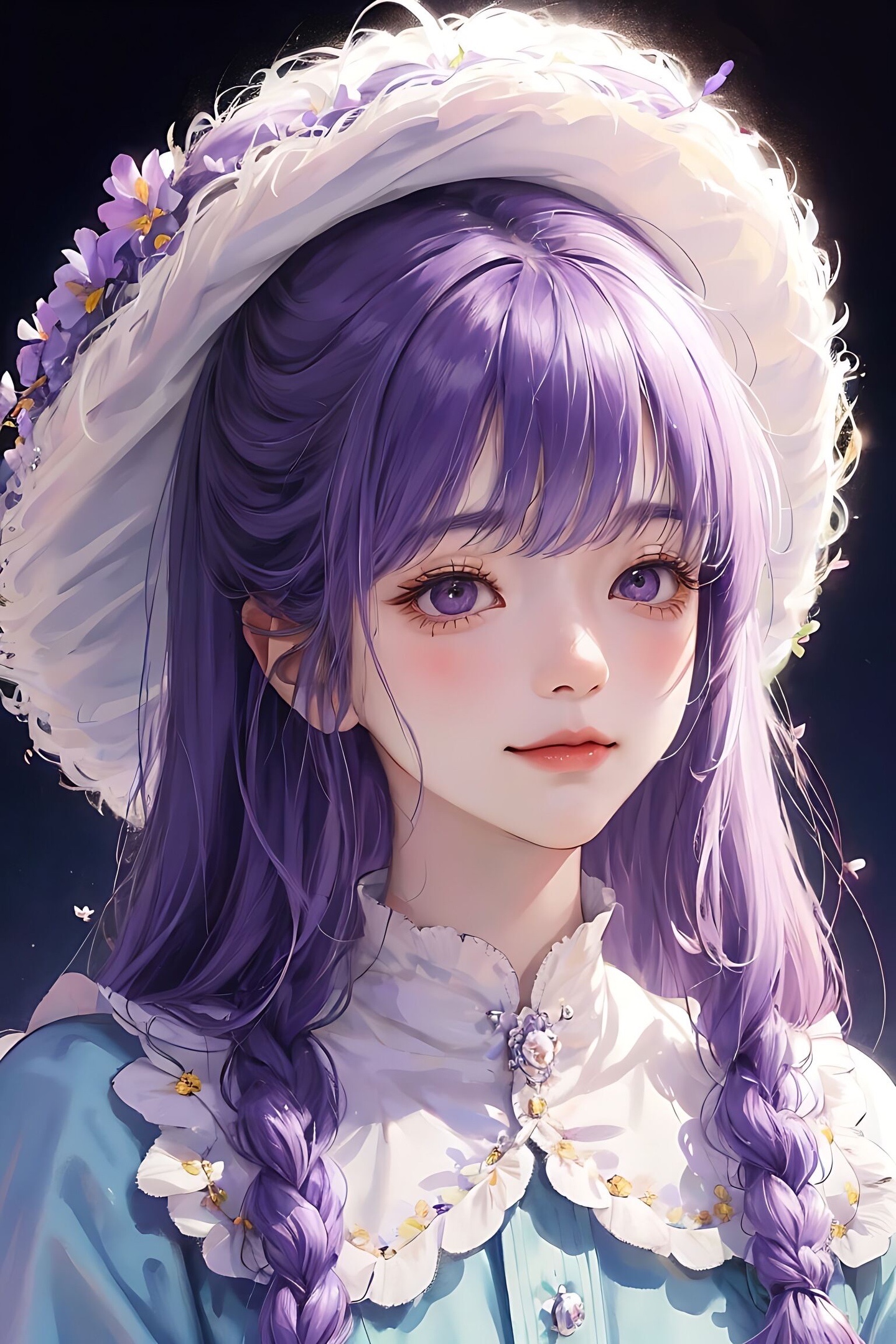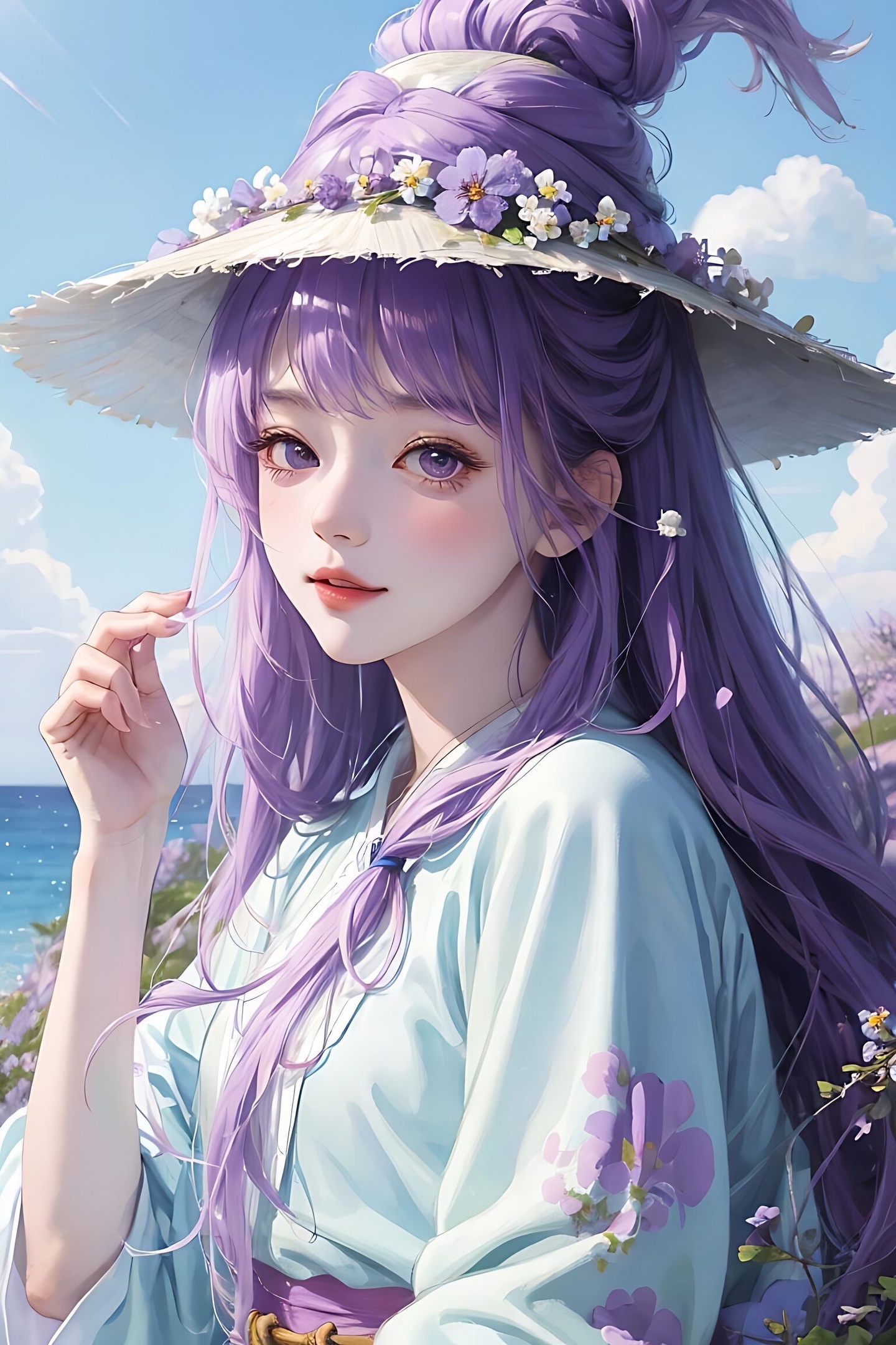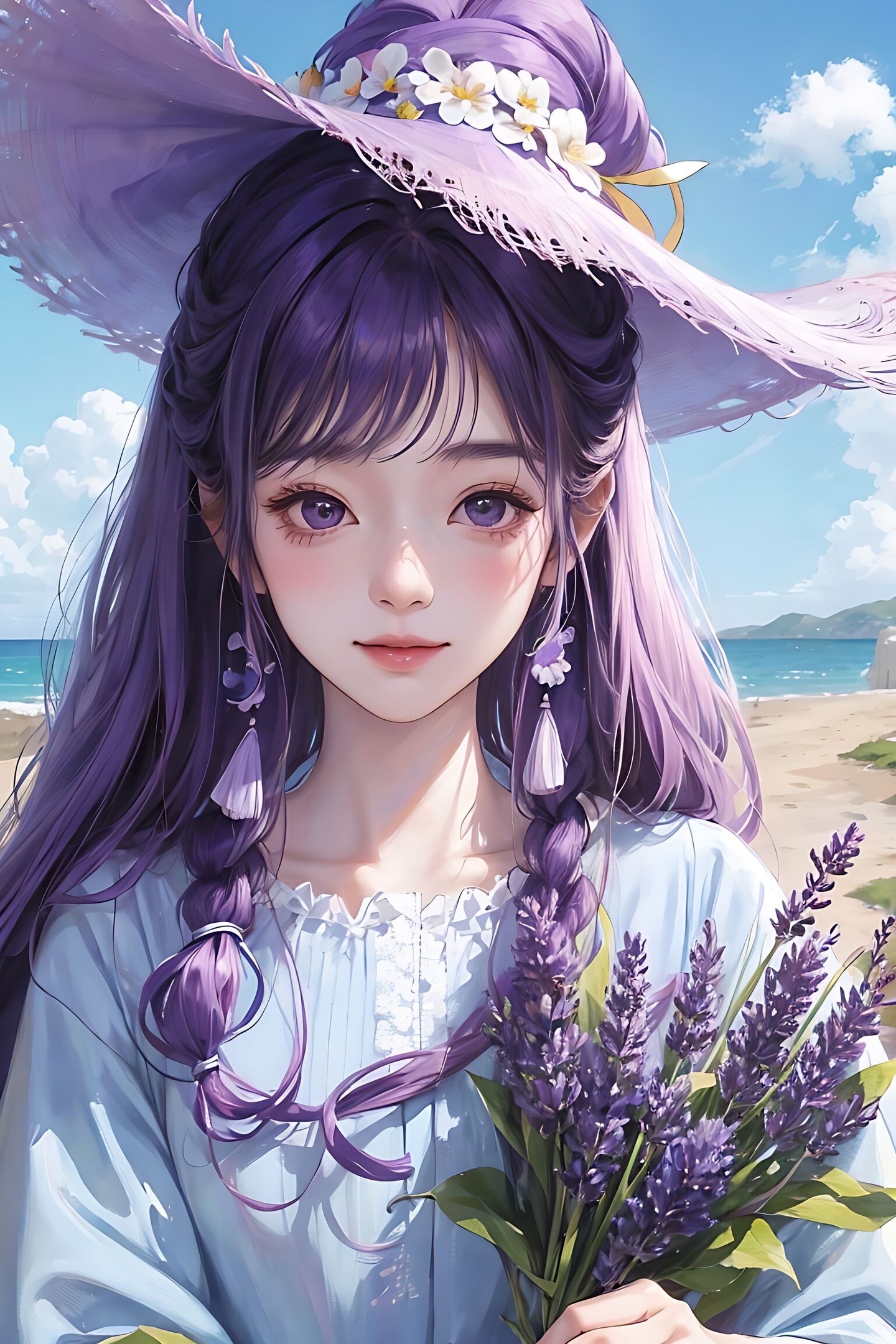 宫崎骏 1个女孩 戴粉色圆帽子,蓝天白云,,羊毛卷头发,身后有薰衣草花海,开心的笑,根根分明的睫毛 大眼睛,紫色薰衣草衣服,8KCG壁纸,最佳质量,特写,半身像