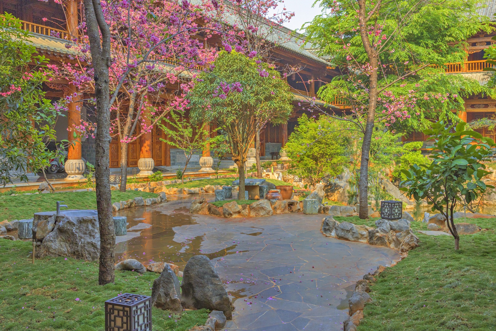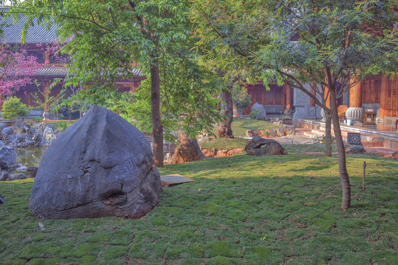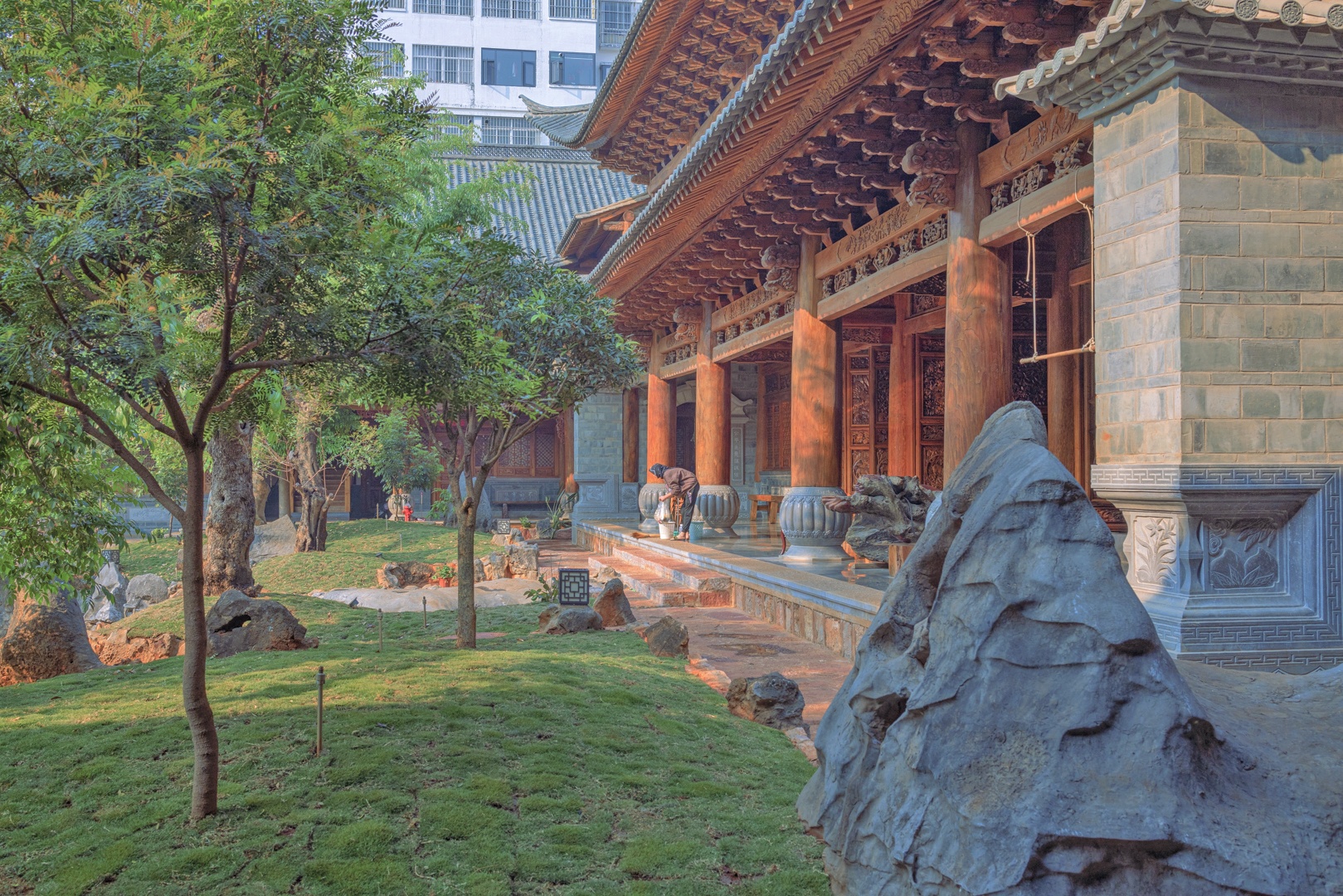 大殿外有一个宽敞的院落,里面花红柳绿,景色秀丽。只见不多的几个人,在忙着给花浇水,打扫并整理着院子。