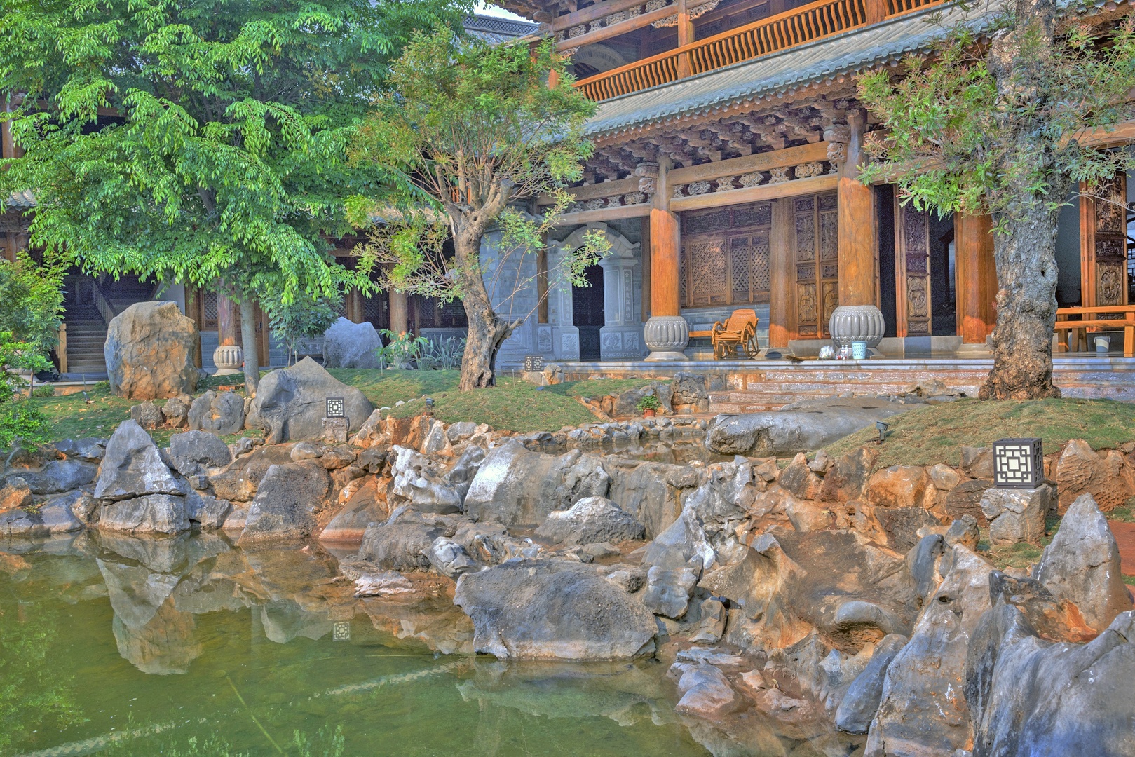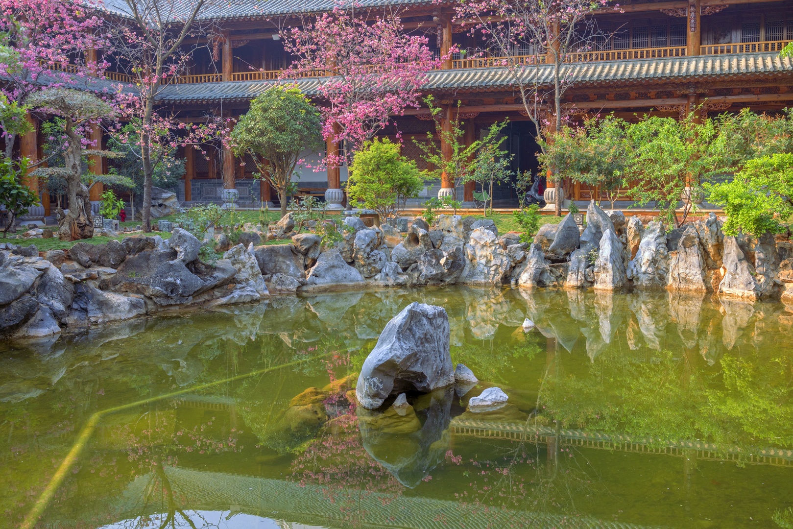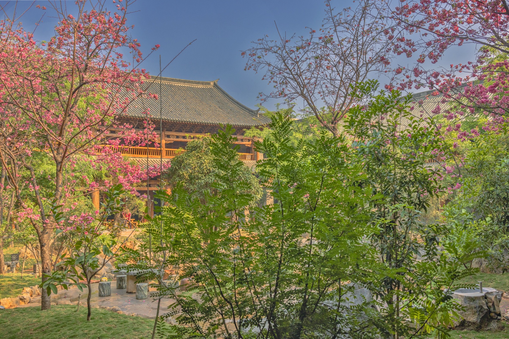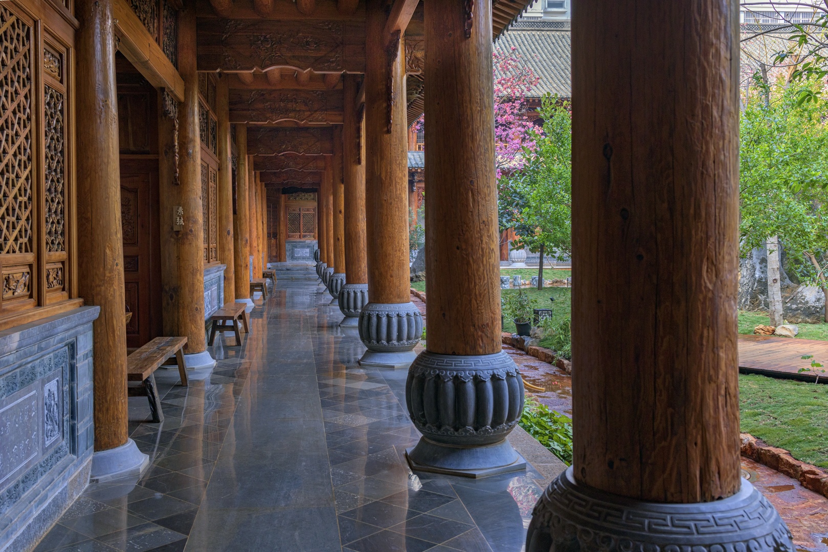 大殿外有一个宽敞的院落,里面花红柳绿,景色秀丽。只见不多的几个人,在忙着给花浇水,打扫并整理着院子。