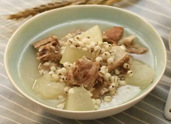 接着放入薏米、姜片,倒入足量热水,开大火煮开,再转小火煮到排骨熟。