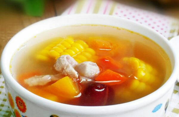 瘦肉放在碗中,加水浸泡 一会儿。胡萝卜去皮洗净,切成小块。新鲜玉米洗净,切成小块。红枣洗净,去掉枣核。