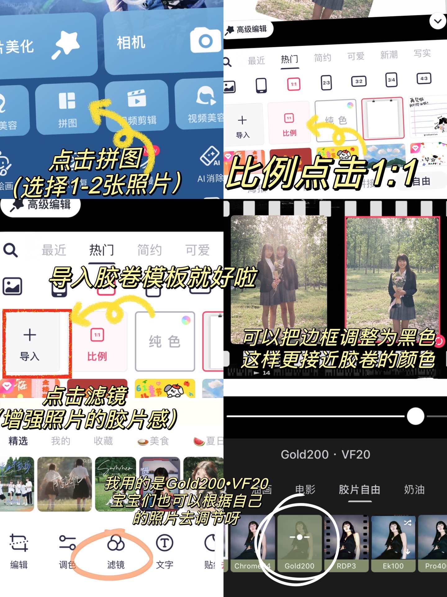 在朋友圈洗胶片啦,最近get到这个,好喜欢🍓🐰咻咻的这个模版,好好玩,把生活的日常拼起来真的有一种洗胶卷的感觉~,操作也很简单!选择两张喜欢的照片,先调一个自己喜欢的胶片滤镜,点击自由模式1:1的比例,随后倒入胶片的模版就好啦~大家可以把边框也调节成黑色,这样更逼真!