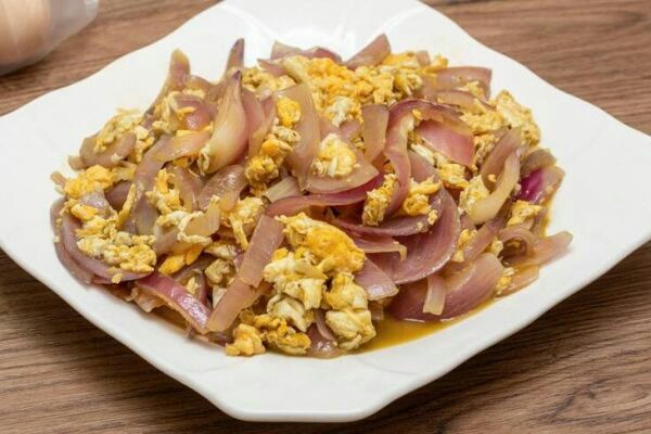 洋葱去掉外皮,洗净后切丝,鸡蛋打散在碗里,来点料酒去腥,葱花也切好。锅内加油,烧热后倒入蛋液,炒熟盛出来。然后重新起锅,爆香葱花后,将洋葱倒进去,直至炒软后,重新倒入蛋液,来点盐、鸡精,炒匀后出锅。
