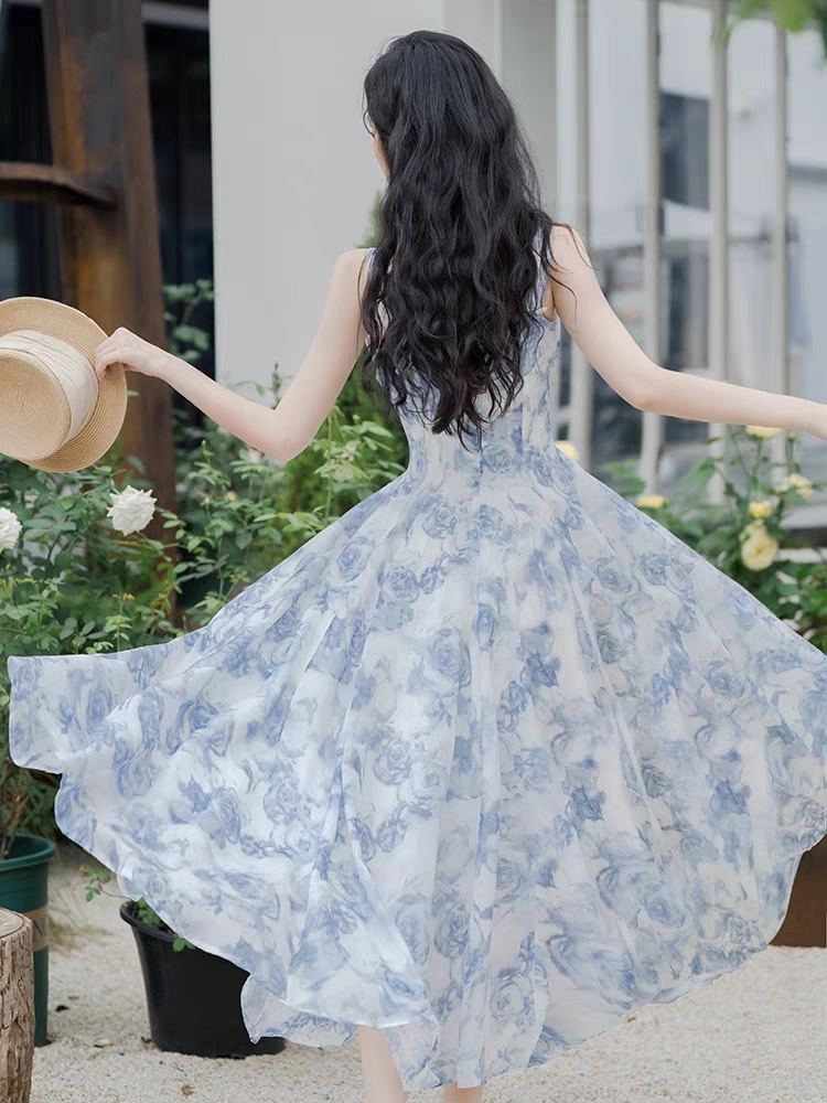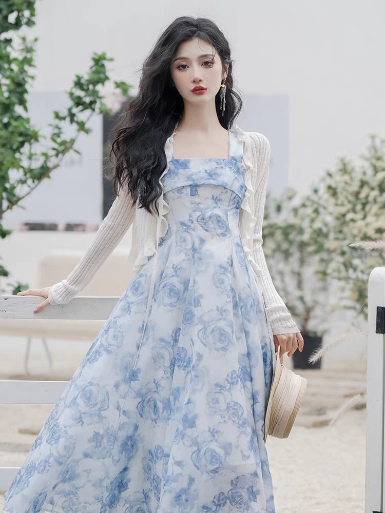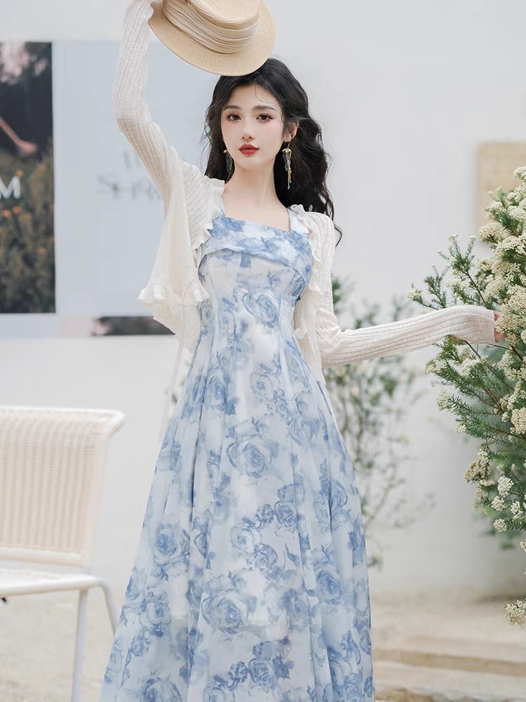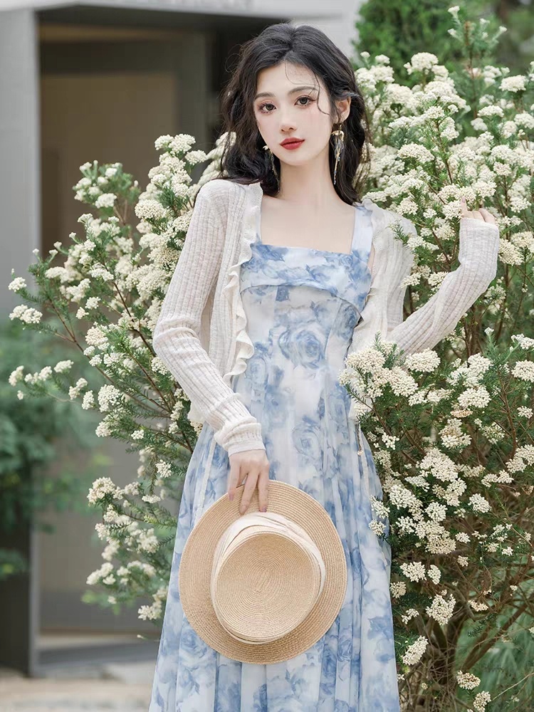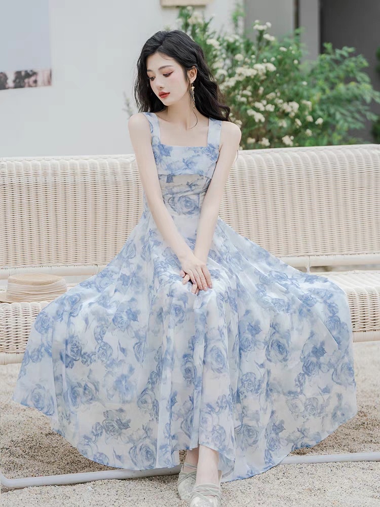 法式碎花浅蓝色方领吊带连衣裙超仙海边度假沙滩裙别致绝美两件套