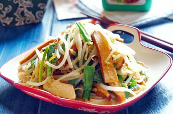 韭菜摘净并去掉根部,处理好后清洗干净,沥干水分。豆芽冲洗一下,沥干水分。香干洗净,切成小条。