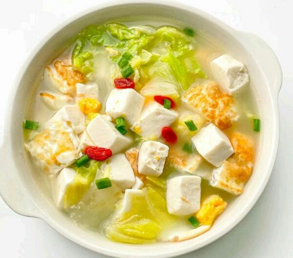 白菜或者娃娃菜分成一片一片,清洗干净,再切成小块。豆腐冲洗一下,切成小丁。老嫩随意选,不过要营养高,推荐用老豆腐。