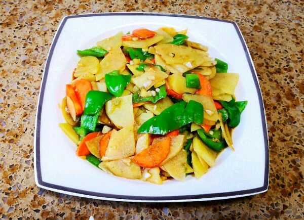 土豆去皮洗净,切成薄片。切好后清洗两遍,沥干水分。胡萝卜去皮洗净切片。青椒洗净,切小块。葱姜蒜切末。