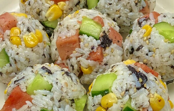 食材:米饭、黄瓜、午餐肉、玉米粒、海苔碎、沙拉酱