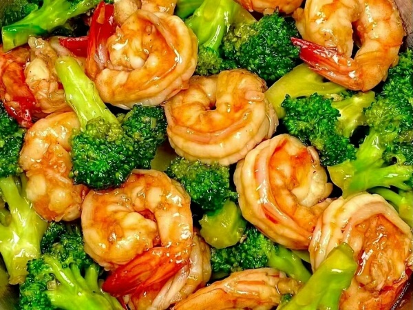 4.另热锅烧油烧油,油热以后,放入蒜末爆香,接着倒入焯好的西兰花一起翻炒几下,炒出蒜香味,再倒入炒好的虾仁一起翻炒均匀。
