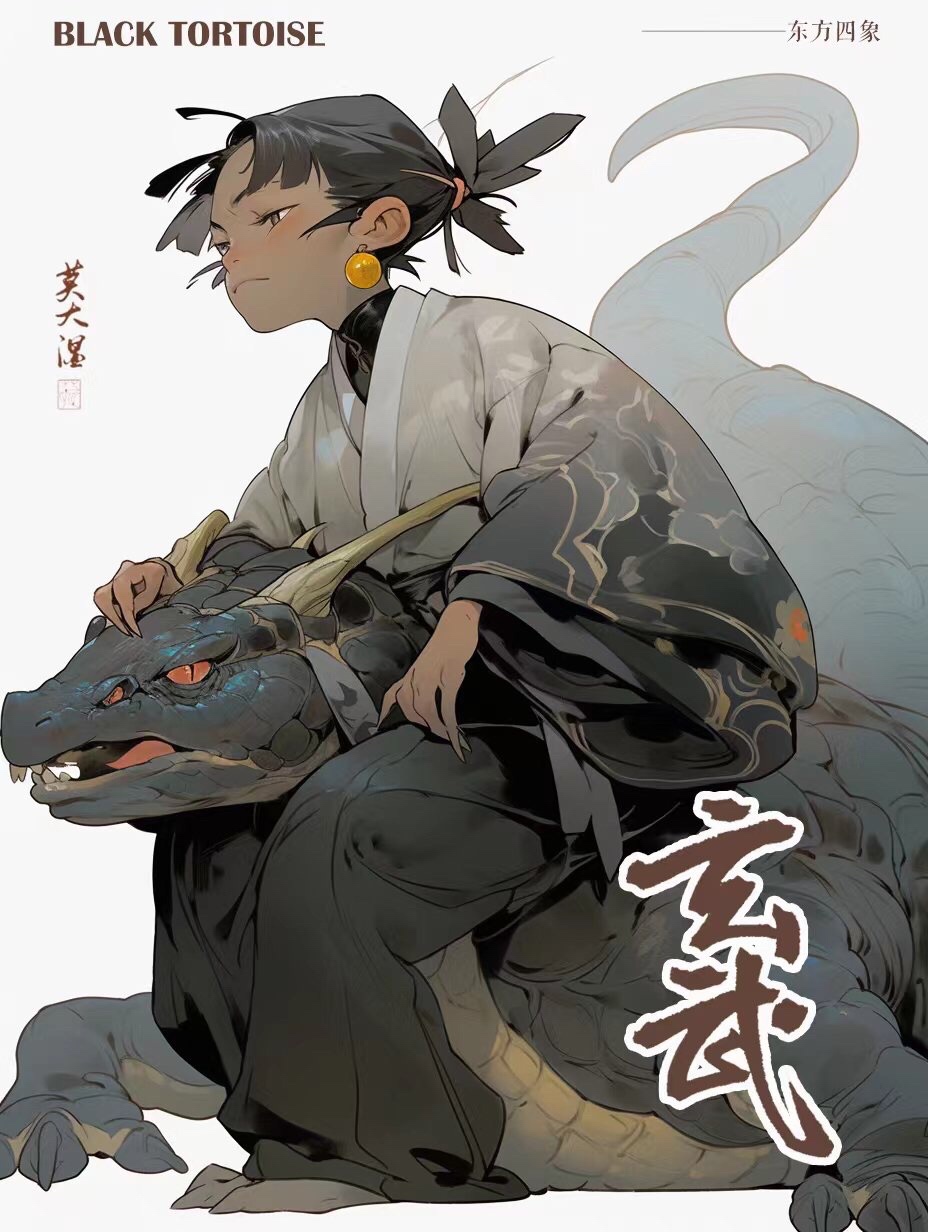 玄武,执明神君,镇北方。五行属水,代表冬季,主风雨。