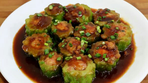 3、蒸锅加水烧开,放入苦瓜酿肉后蒸15分钟,取出后把盘子里的汤汁倒入锅中,加入适量食盐、生抽、蚝油、淀粉,小火煮至浓稠,浇在苦瓜酿肉上即可。