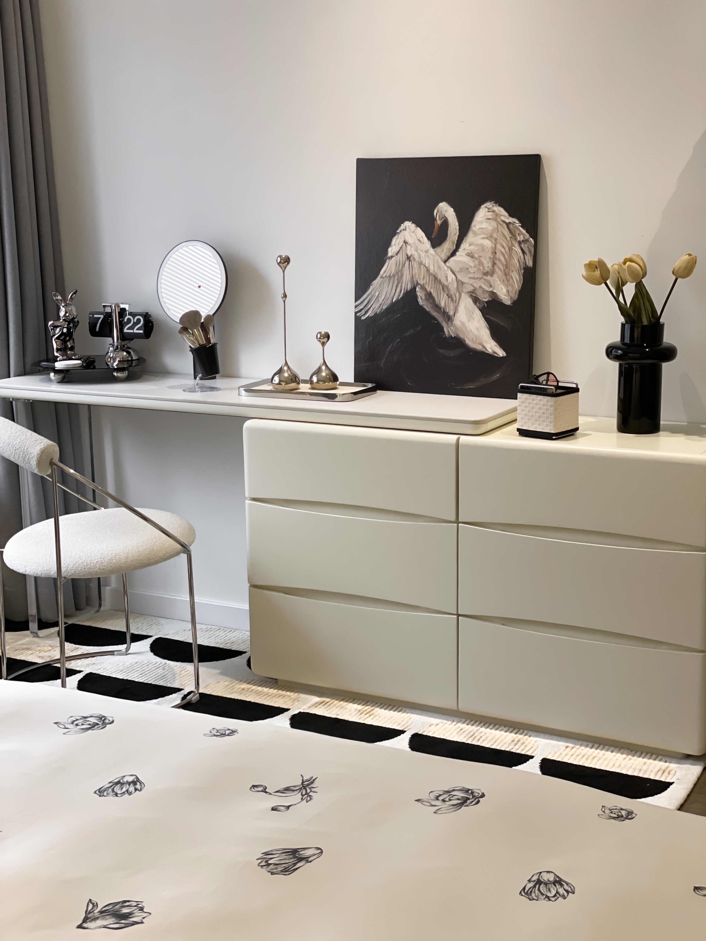 床尾有空间的也可以试试斗柜梳妆台来增加收纳功能~