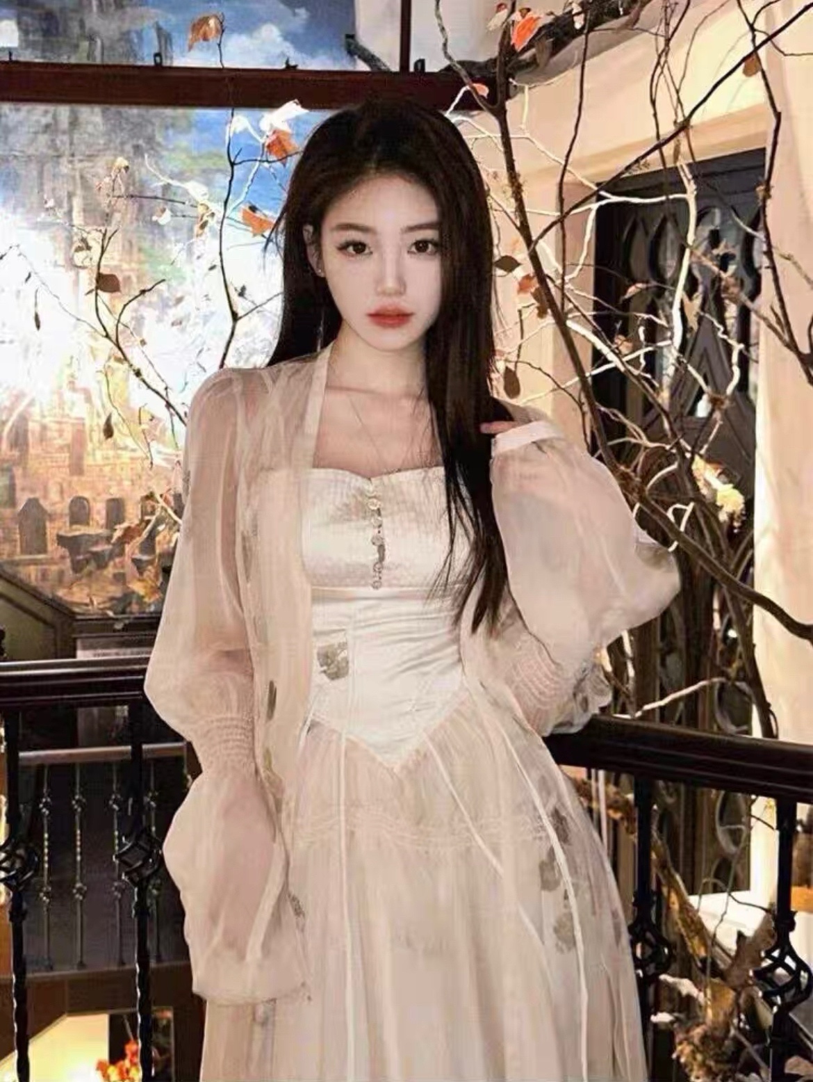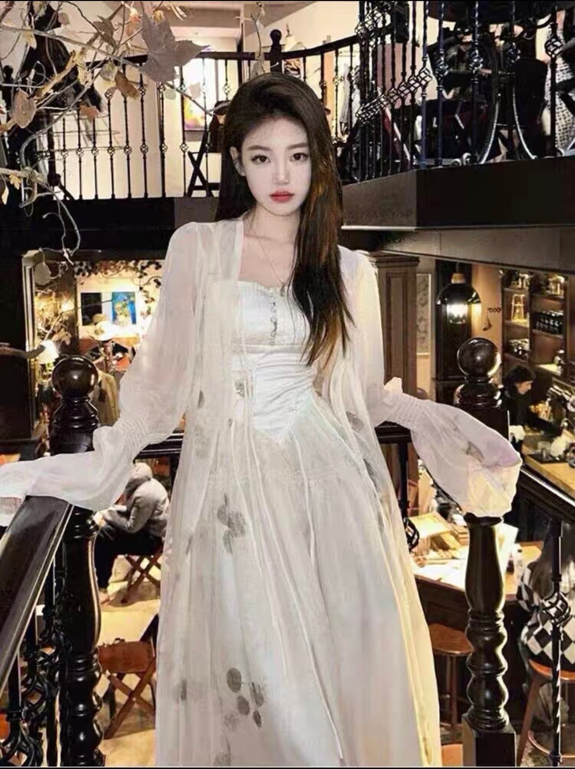高级感新中式国风吊带雪纺收腰连衣裙套装开衫薄纱度假仙气长裙