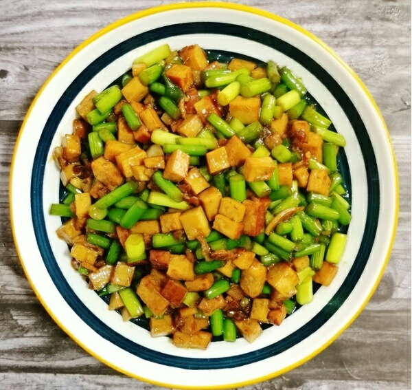 蒜薹去掉尾巴,清洗干净,切成小粒。豆干冲洗一下,切成小丁。