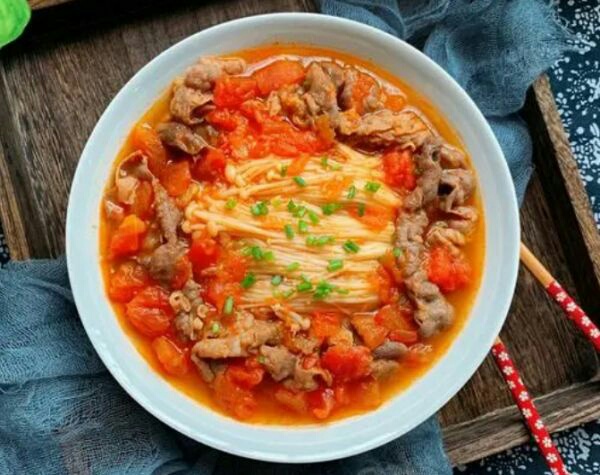 西红柿清洗一下,然后入锅煮一两分钟,再将外皮去掉,切成小块。金针菇去掉根部,清洗干净。