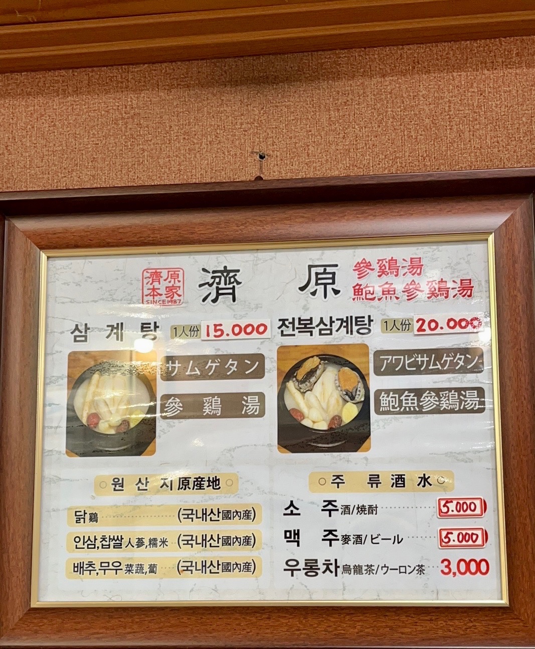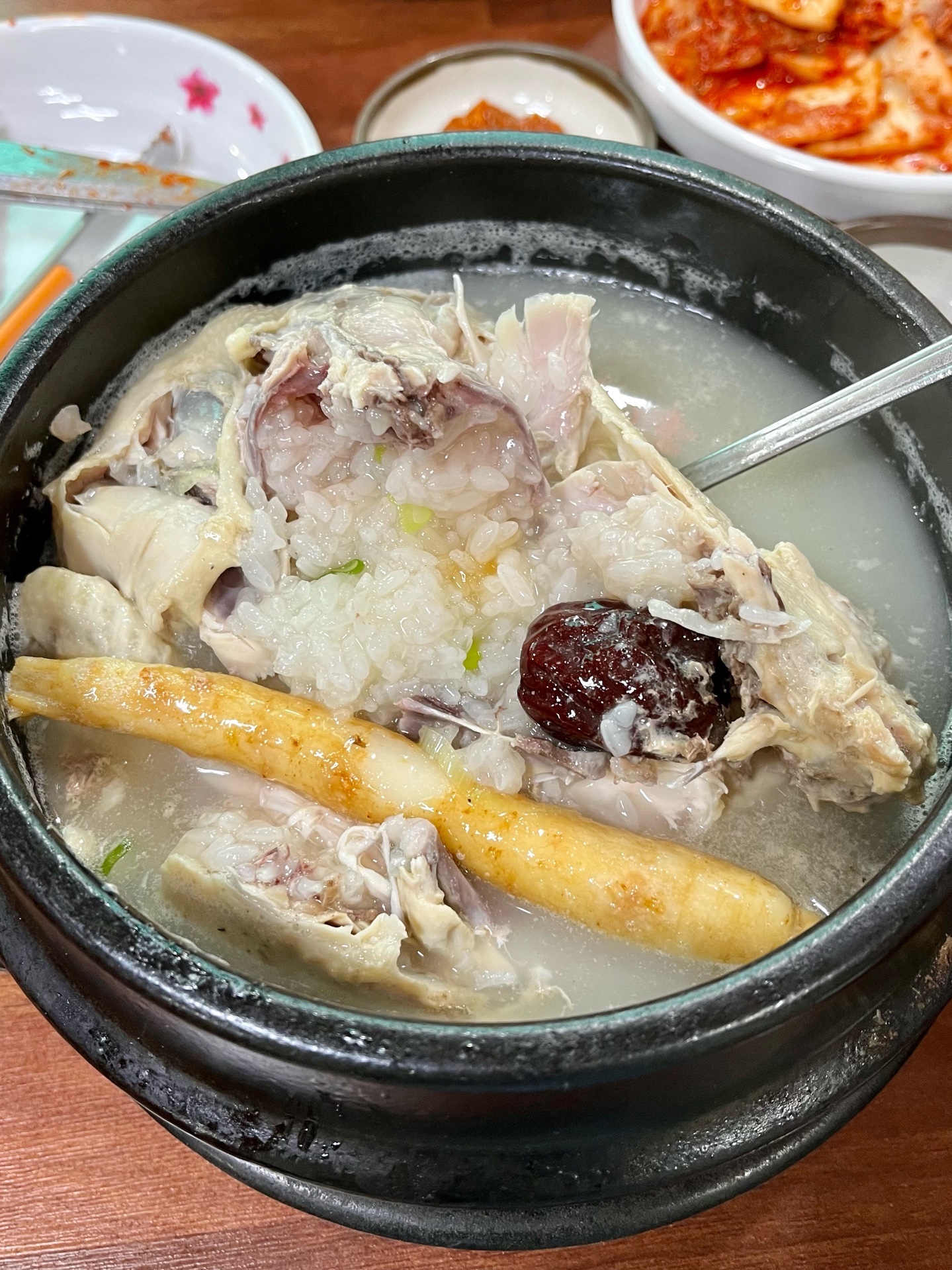 最后一天逛完新罗免税店出来吃的,走路几分钟?好像只有两种,鲍鱼参鸡汤和普通参鸡汤,不油不腻,人参和糯米泡在整只鸡里。太烫了。