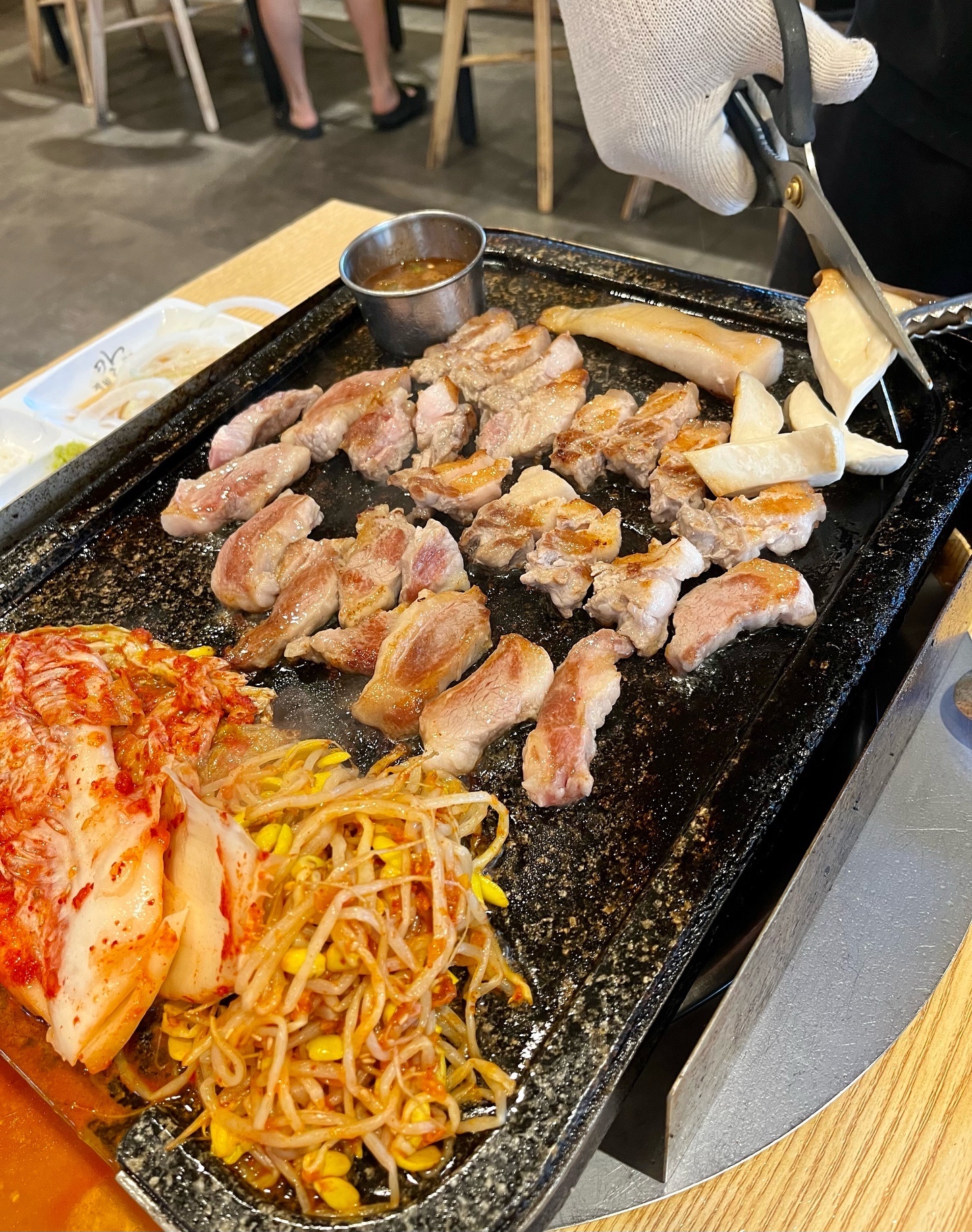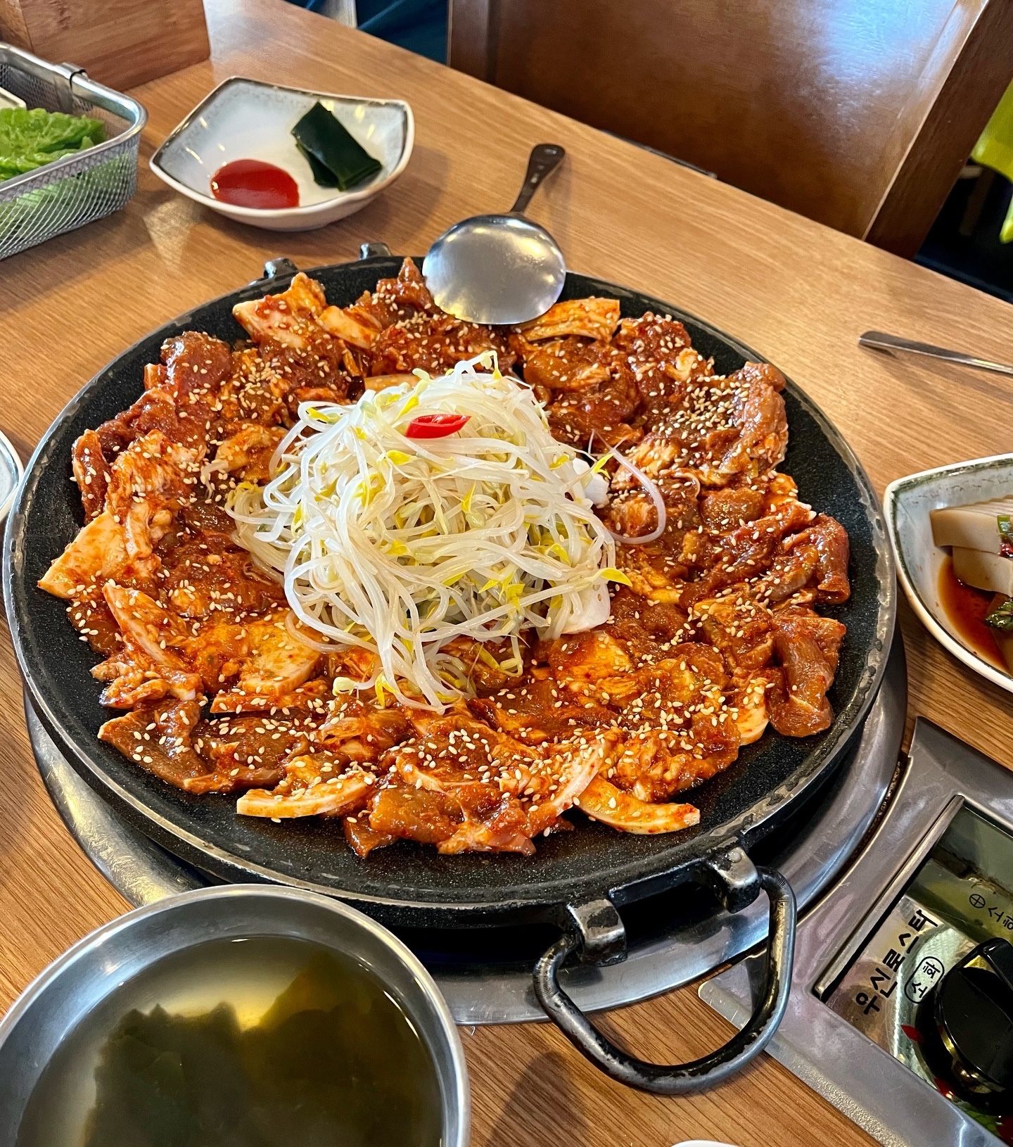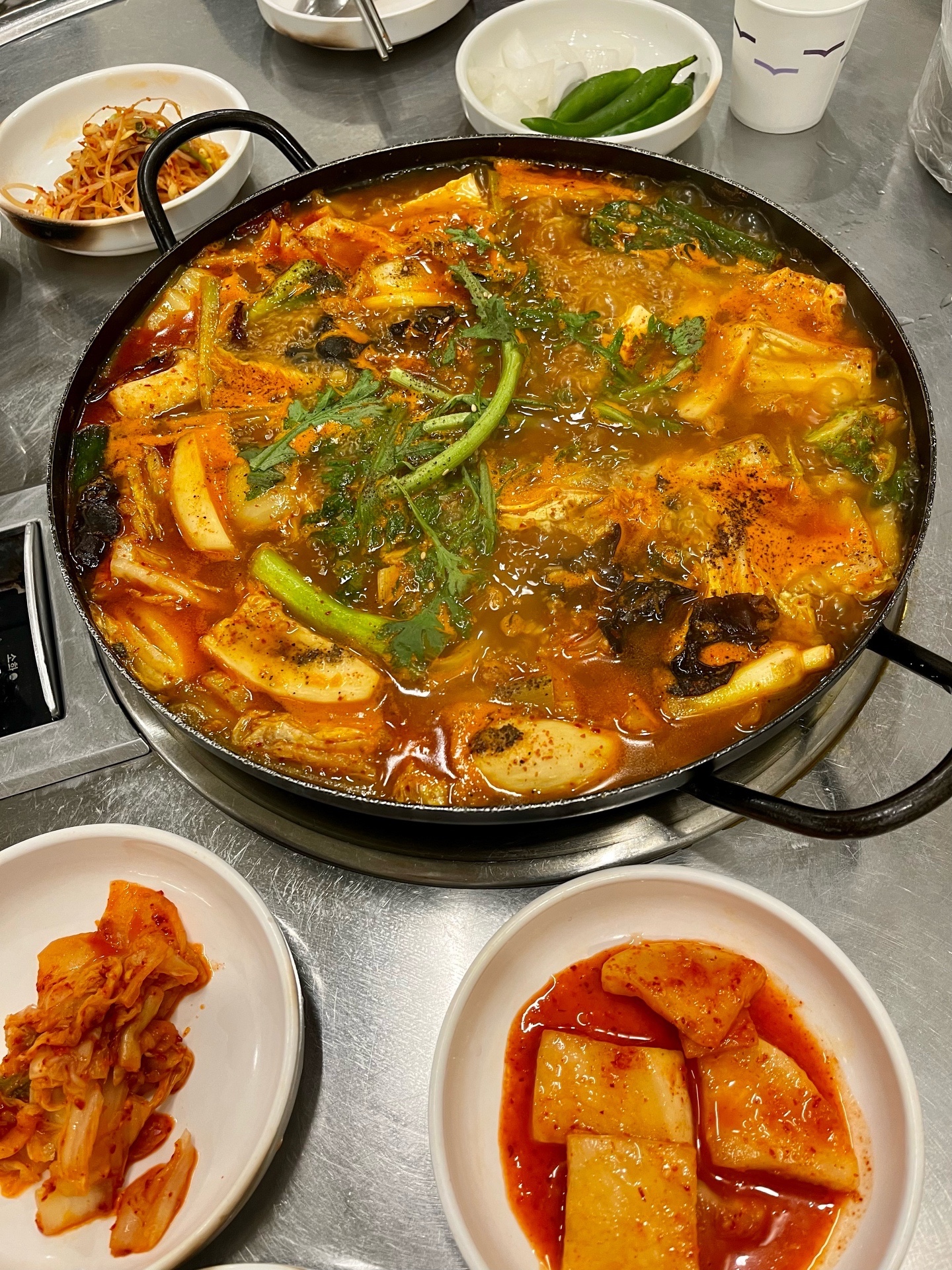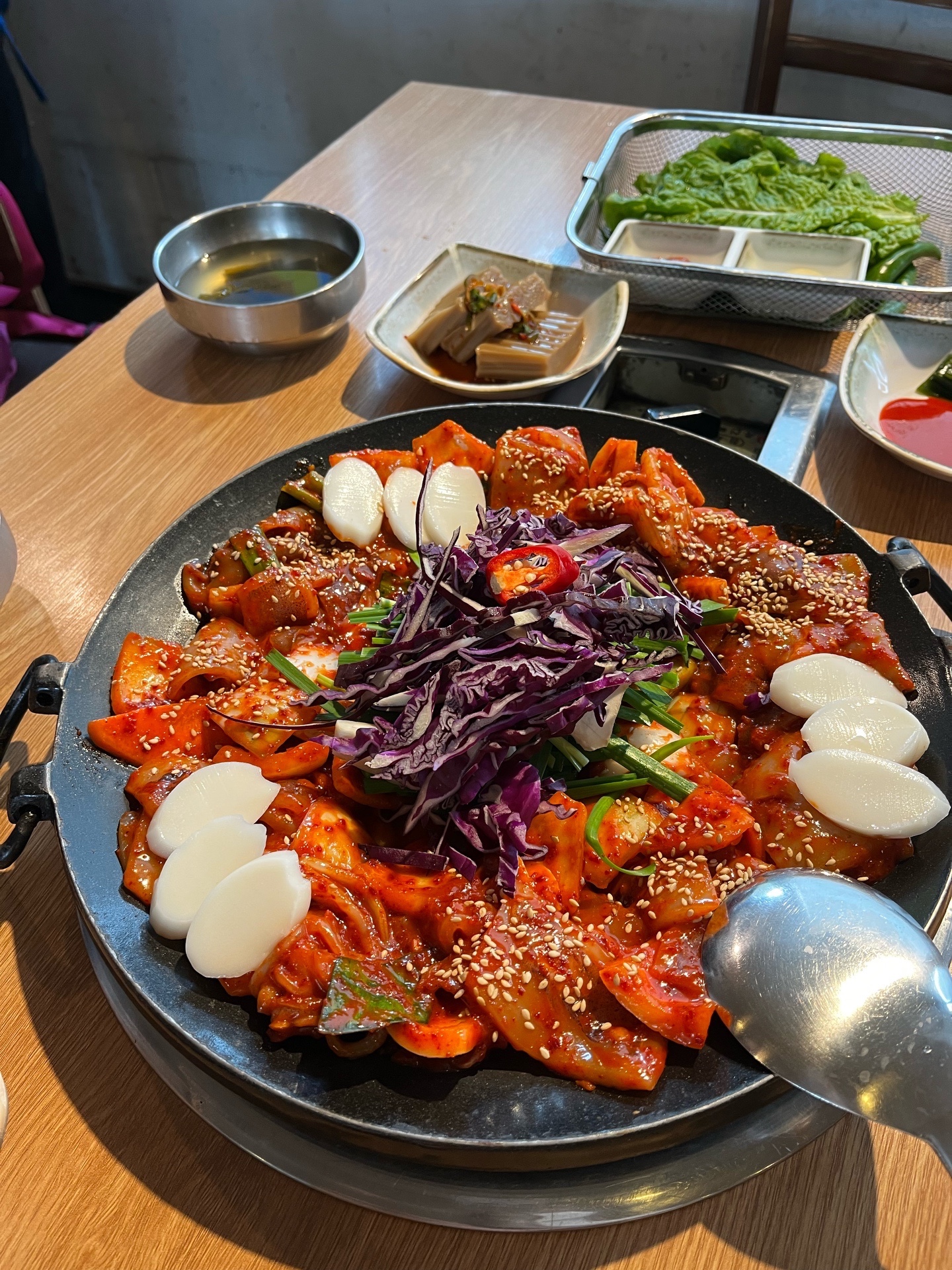 我觉得猪肉锅比鱿鱼锅好吃,因为鱿鱼锅太辣啦!这家店的服务员有个小哥,会把炒饭堆成汉拿山的形状,淋上芝士和蛋汁,会一边帮炒饭一边讲济州和牛岛的历史,我朋友夸他“你的中文讲得好好”,小哥“我山东的!”