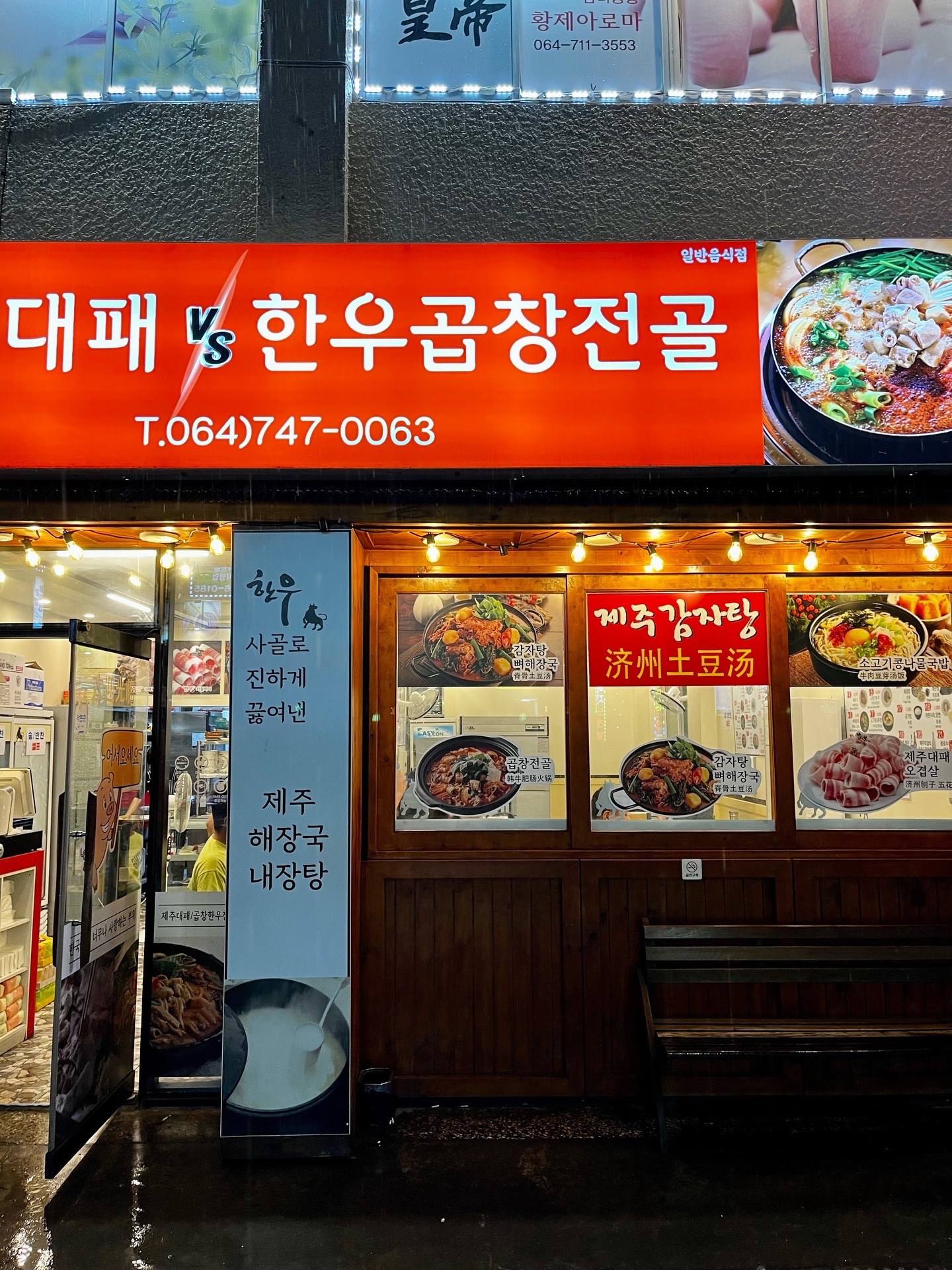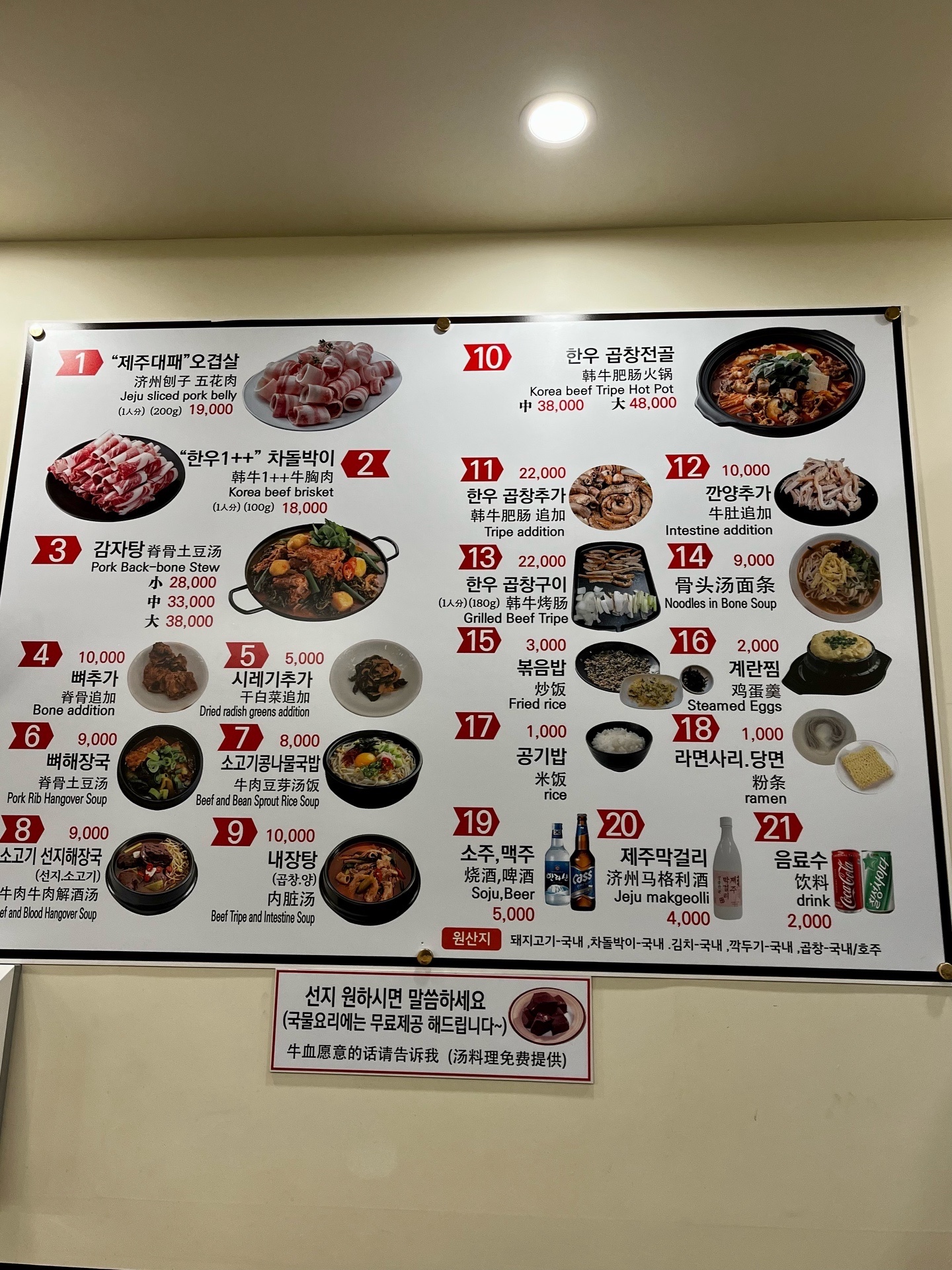 也不记得店名,因为夜里下雨出了酒店随便进的,在济州岛阳光酒店附近50米?对面是CU便利店。这家店服务体验感第一棒!老爷爷不会说中文,但全程笑眯眯的,很和善!墙上有中韩互译版菜单。