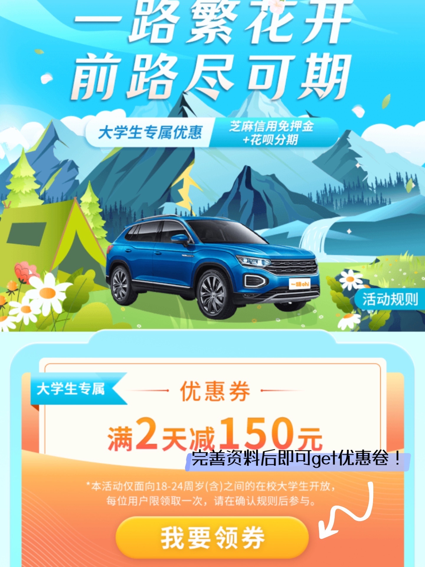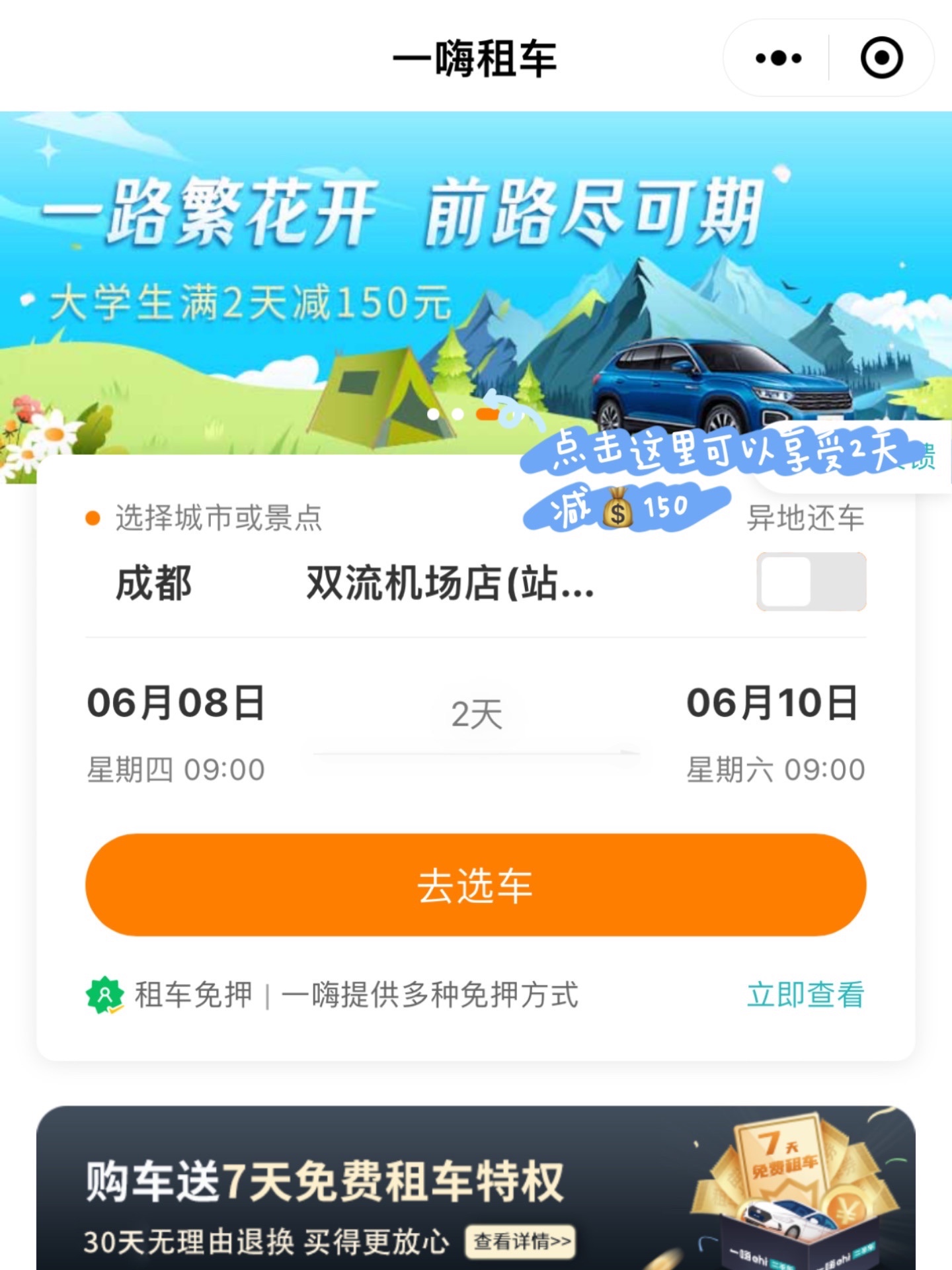 怎么玩儿最方便节省时间!肯定是租车啦~suki出行都是在【一嗨租车】搞定哒~一嗨支持“免收车辆押金”,学生党也不用担心押金不够~一嗨全国服务网点多达11000个!任意网点都支持异地取、还车~24小时客服/救援/门店,出行让人安心有保障~各种车型满足大家不同的预算和需求~对啦!最近18-24岁的小伙伴还可以get 领取大学生专属优惠券~满两天立减150元~咱又多一餐火锅钱~