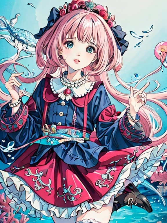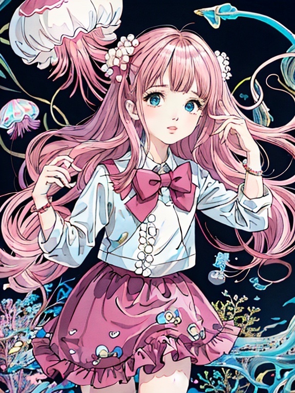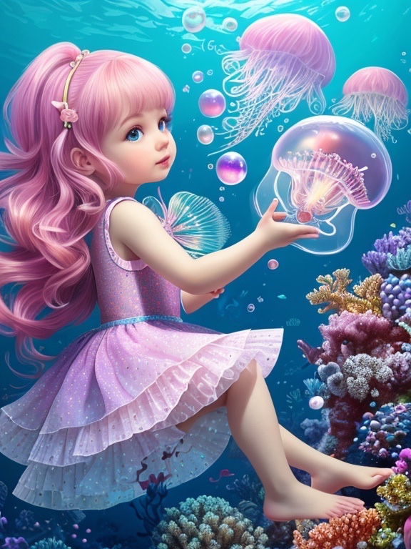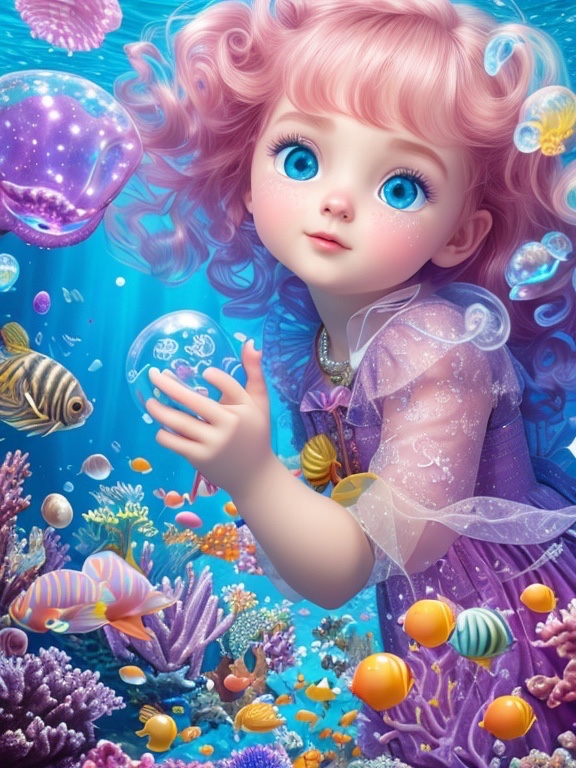 海底,梦幻泡泡,鱼儿,穿水母裙子的小女孩,可爱的脸,粉色脸颊,珍珠