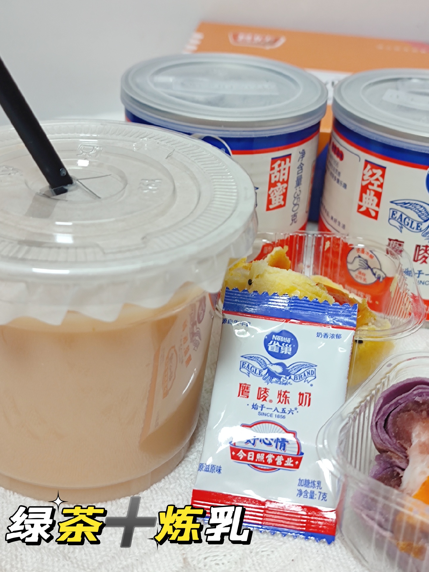 将绿茶和炼奶搭配在一起,还🉑以加点冰块