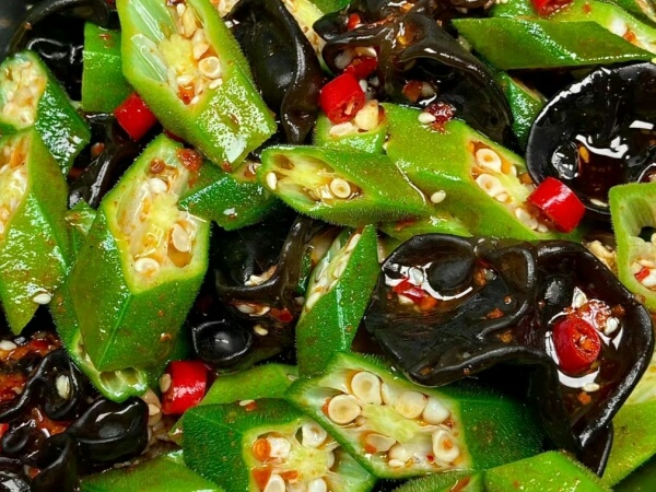 食材准备:秋葵、木耳、蒜末、小米辣、辣椒面、白芝麻。