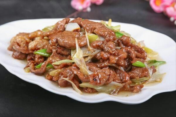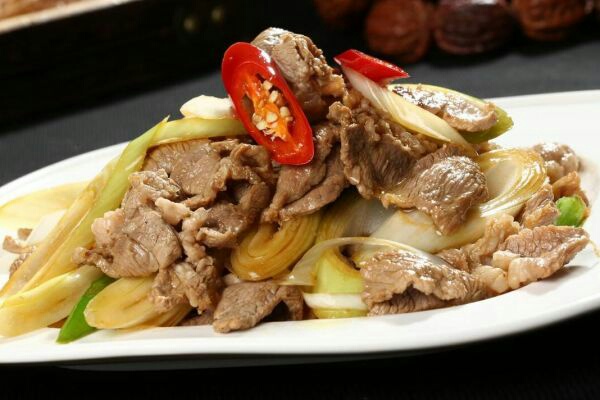 2、锅子里倒油,放入腌制好的牛肉,不停翻炒,炒到变色之后,接下来加上盐、生抽、老抽、蚝油来调味,接着把洋葱、大葱也都倒进去,大火不停翻炒,直至完全炒熟后,即可关火出锅。