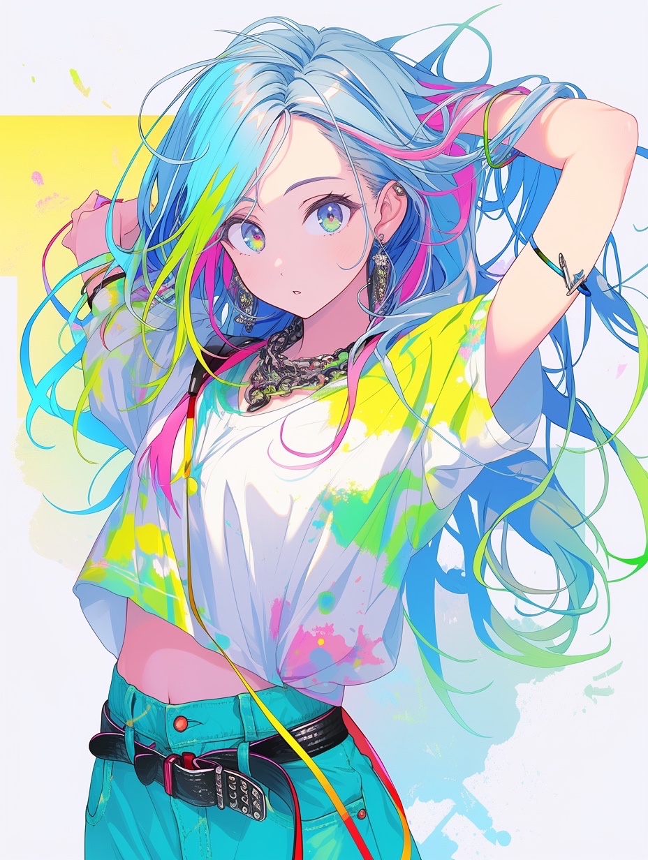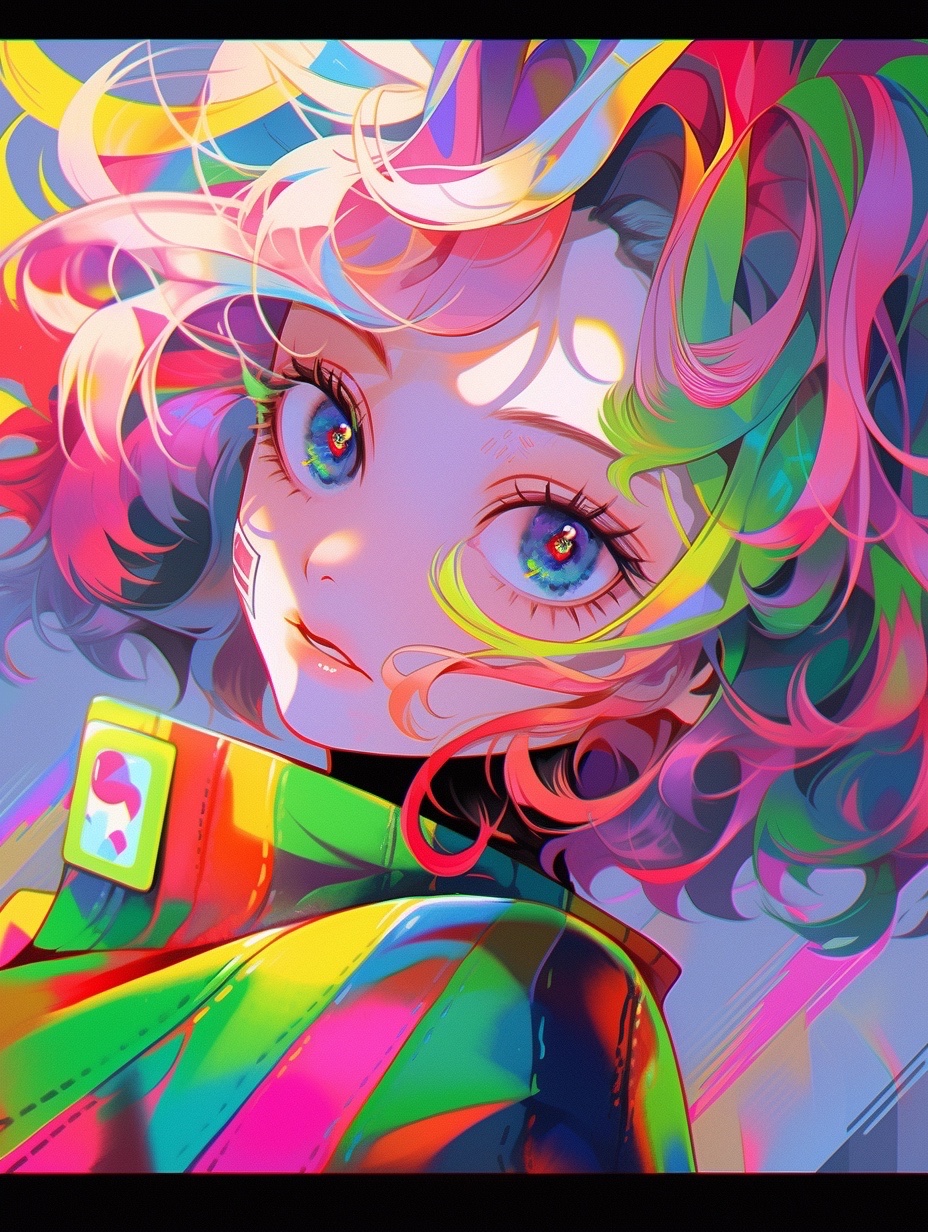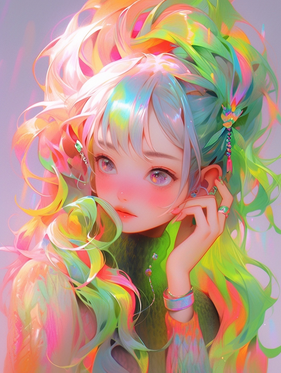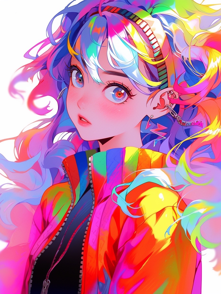 咒语:anime girl with colorful hair is posing for photography, in the style of digital art wonders, colorful caricature