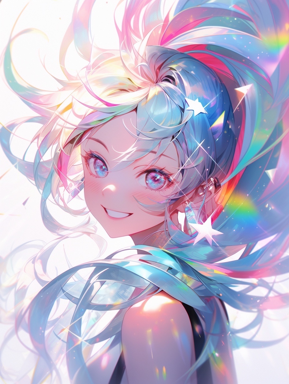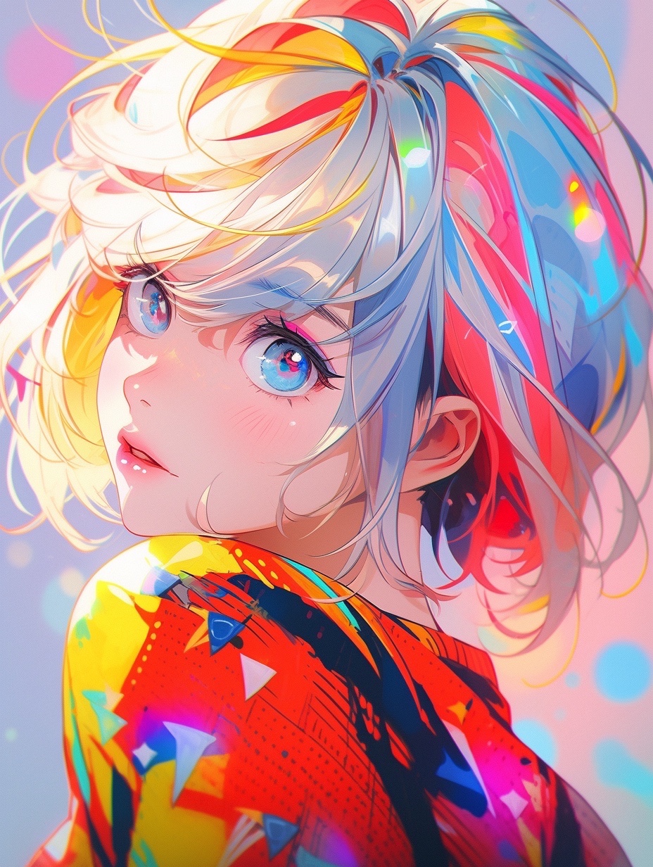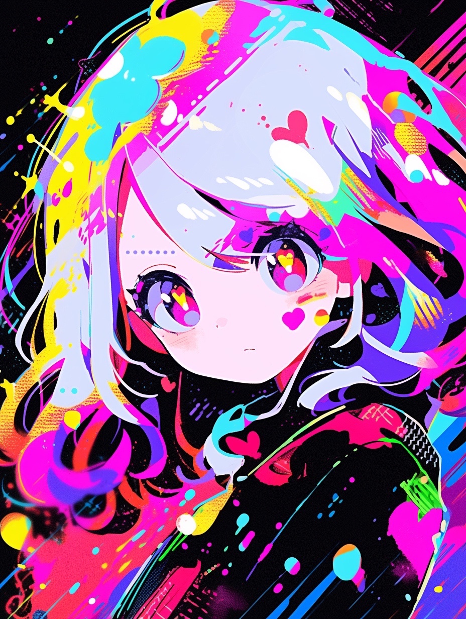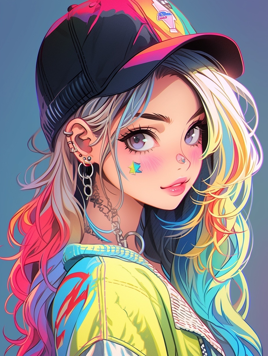 咒语:anime girl with colorful hair is posing for photography, in the style of digital art wonders, colorful caricature