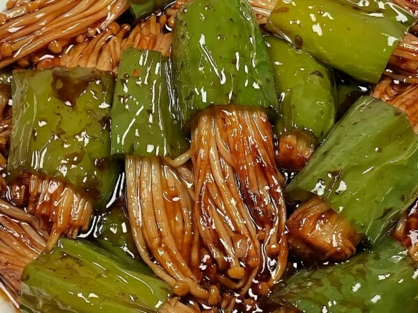 准备食材:青椒,金针菇,蒜末,酱汁。