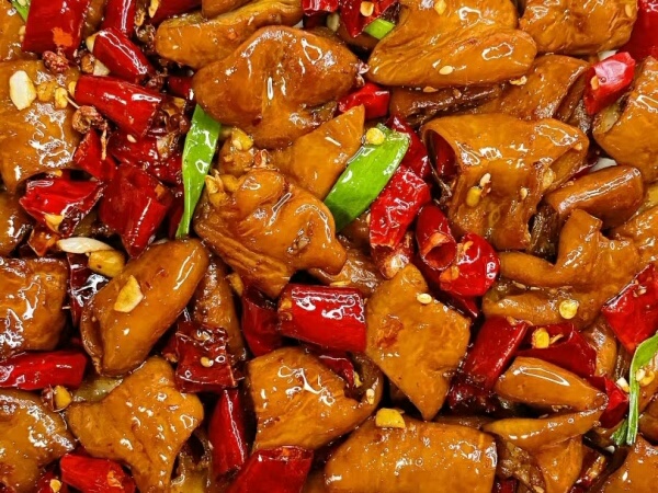 4、起锅烧油,油热后放入猪大肠煸炒一会儿,炒出油脂后盛出备用。锅中底油爆香蒜末、干辣椒、花椒,再放入肥肠翻炒均匀。