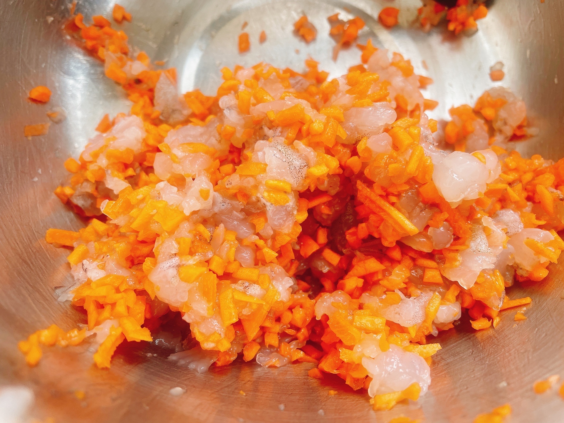1.大虾剁碎也可以用虾滑,放入胡萝卜碎