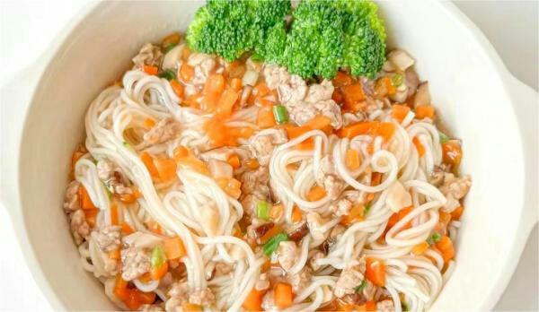 步骤二:锅中烧油,先把肉末炒至变色,再把胡萝卜丁、香菇丁,下锅炒香,加点生抽、盐调味,加半碗淀粉水,煮至浓稠,倒入煮好的面条即可。