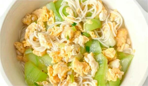 步骤三:锅中烧油,蛋液下锅炒散盛出,再把丝瓜块下锅炒软,倒入鸡蛋、料汁,煮至浓稠,再把面条下锅拌匀即可。