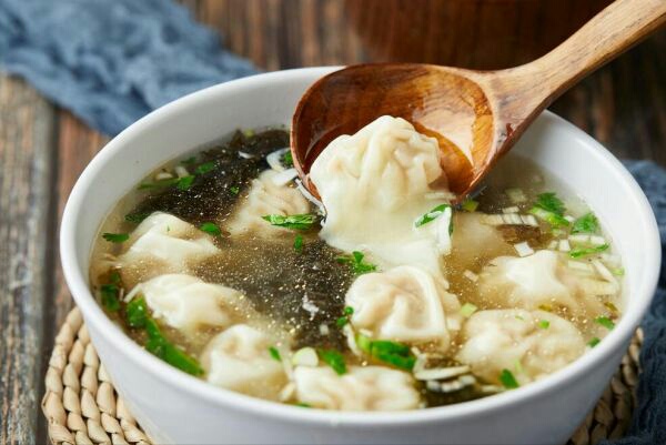 4.锅内加水烧开, 将馄饨放入锅中,煮熟至浮起。舀两勺煮馄饨的水倒入提前准备好的碗中,制成汤料,再捞入馄饨即可。