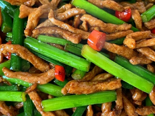 3、起锅烧油,油热后放入蒜末炒出香味,再放入蒜苔翻炒几下,炒至断生后放入肉丝翻炒均匀。最后放入小米辣翻炒几下即可出锅装盘开吃。