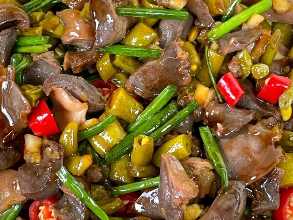 准备食材:酸豆角,鸡胗,葱段,小米辣,蒜末。