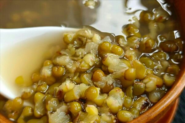 5、为何要放白醋呢,因为我们的清水,实际上都是呈碱性的,煮出来的绿豆汤就容易发红,用白醋来中和一下,就不会变色了,这是第三个妙招。盖上盖子,中小火煮上10分钟,绿豆就完全煮开花了,非常浓稠的状态,再继续煮10几分钟,就可以关火、晾凉开喝啦。