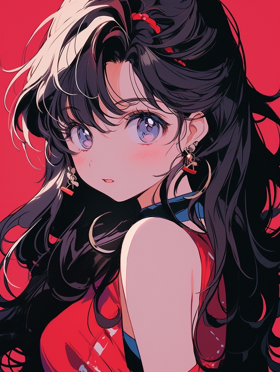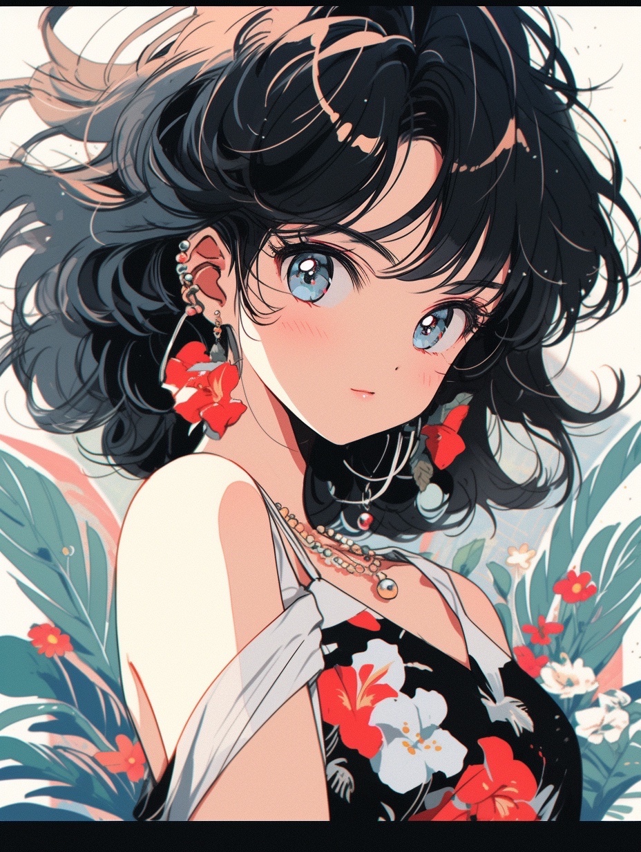 2⃣️完整咒语:an anime girl in sunglasses, biy eyes, wear camisole, long hair, cool feeling, summer, Concise and vibrant color, Japanese 80's City Pop, portrait, flowerpunk, clear background --ar 3:4 --niji 5