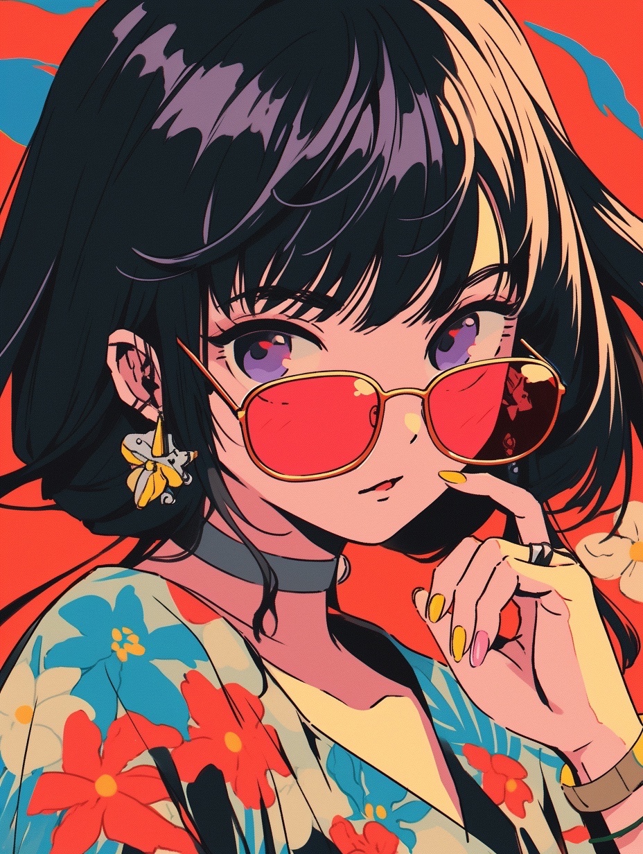 (带着太阳眼镜的动漫女孩,大眼睛,穿着背心,长发,酷酷的感觉,夏天的感觉,简洁而鲜艳的色彩,日本八十年代CITY POP的风格,肖像画,花式朋克风,干净的背景)